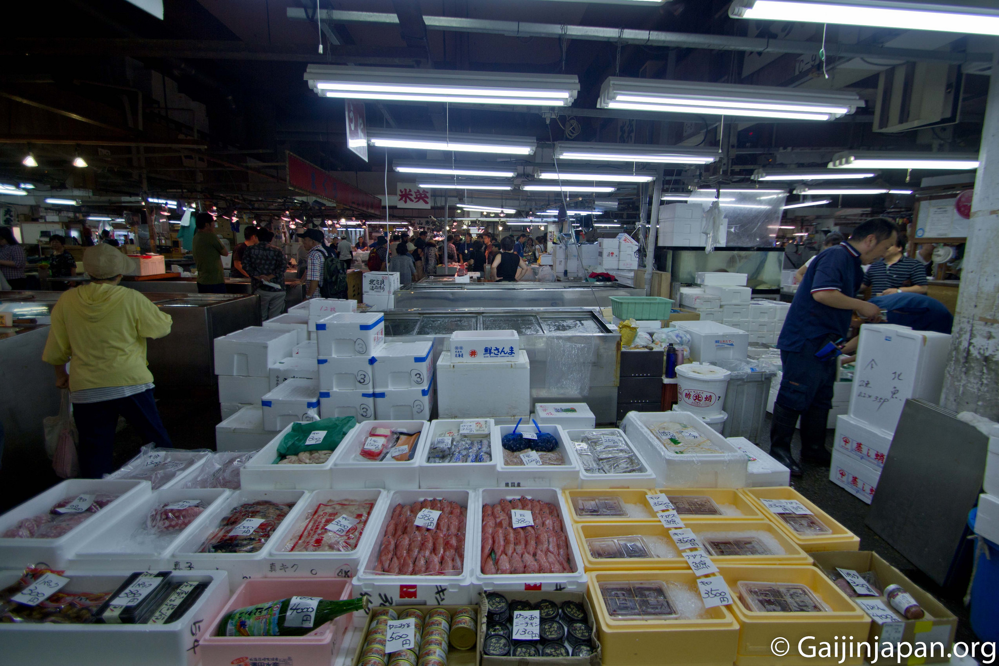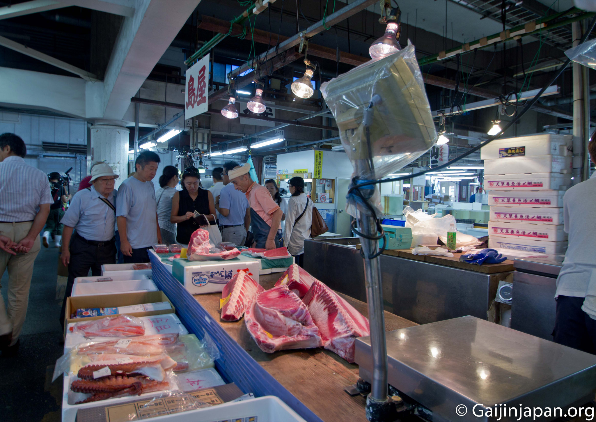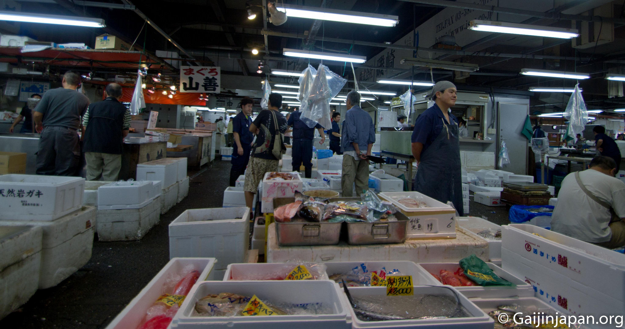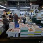 Une fois arrivé sur place et après avoir traversé le parking, on se retrouve à l’entrée du bâtiment principal qui cache, en son sein, la vente de poissons aux gros, et où les professionnels viennent réaliser de bonnes affaires tous les jours. Là, l’ambiance est colorée et vivante et on voit les poissonniers préparer les poissons d’une taille parfois imposante. Il y a plusieurs centaines de variétés différentes qui sont vendues sur place, et contrairement à Tsukiji, il n’est pas possible d’assister à la vente aux enchères de thons rouges.