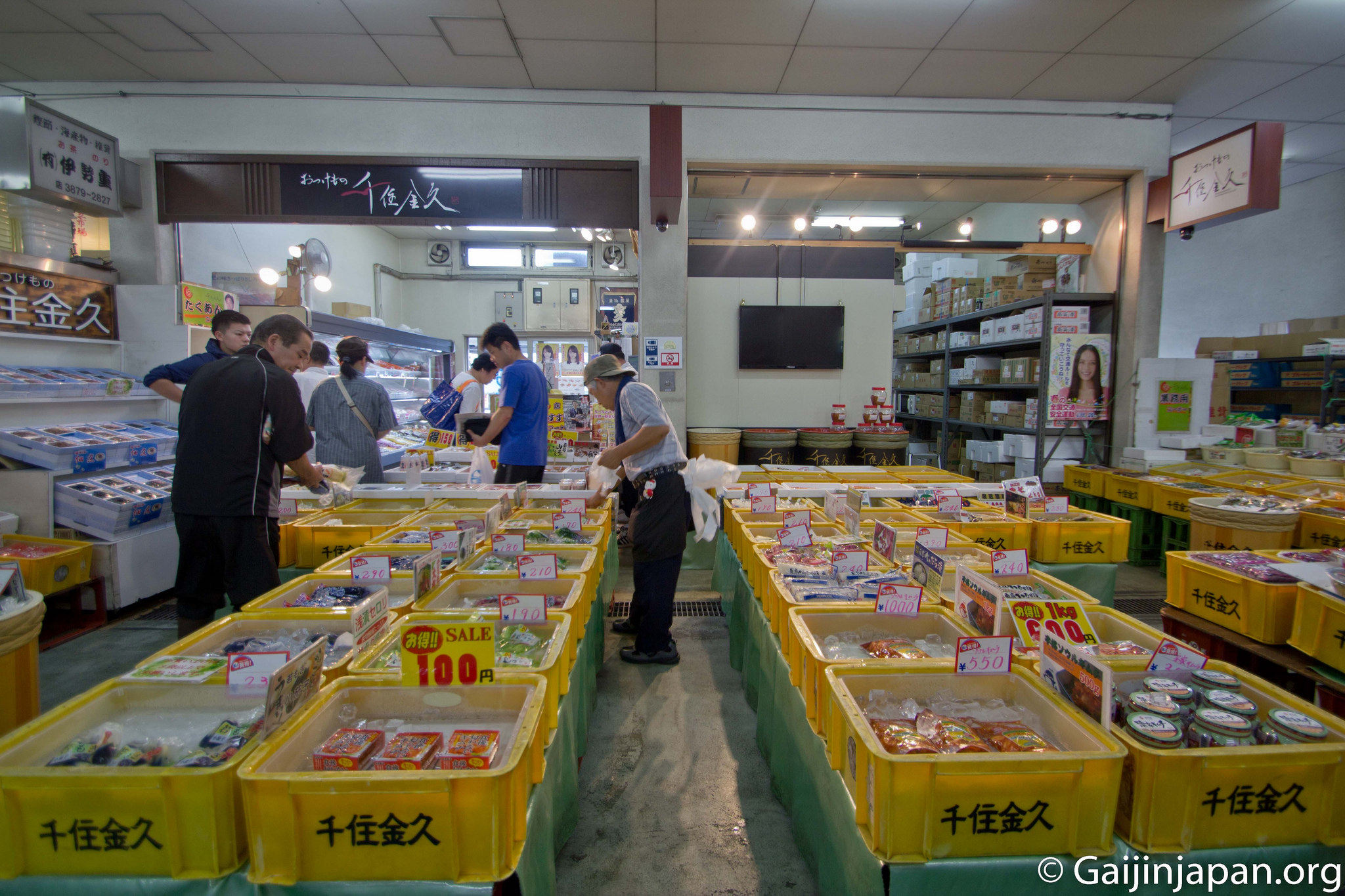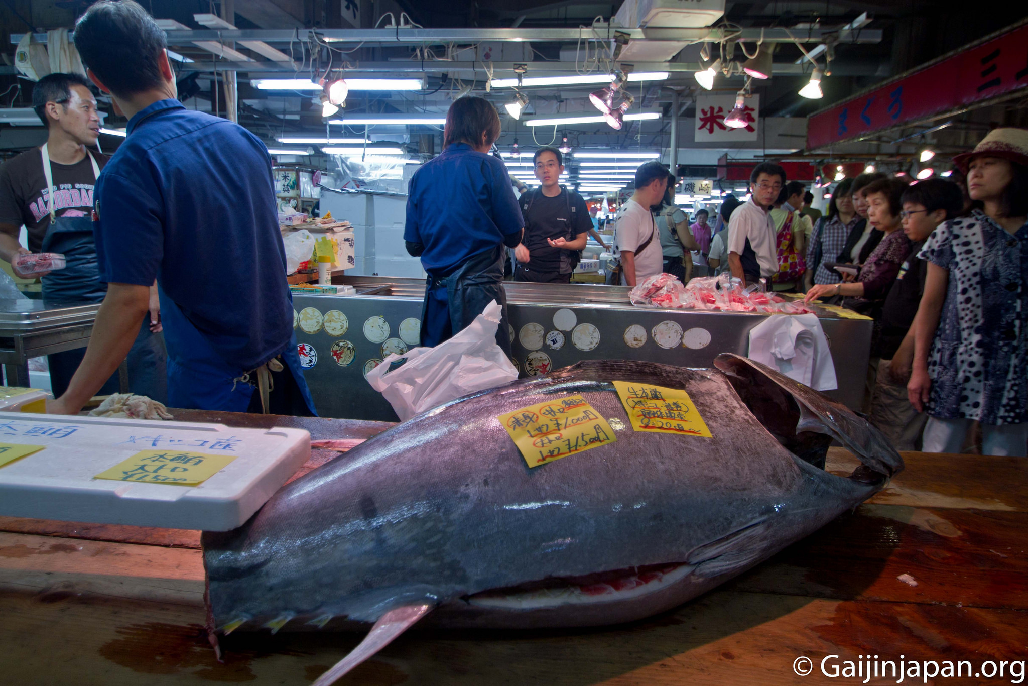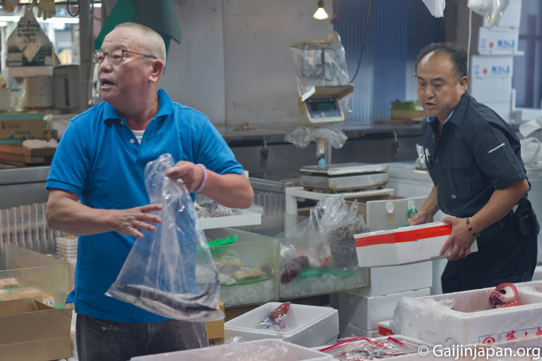 Une fois arrivé sur place et après avoir traversé le parking, on se retrouve à l’entrée du bâtiment principal qui cache, en son sein, la vente de poissons aux gros, et où les professionnels viennent réaliser de bonnes affaires tous les jours. Là, l’ambiance est colorée et vivante et on voit les poissonniers préparer les poissons d’une taille parfois imposante. Il y a plusieurs centaines de variétés différentes qui sont vendues sur place, et contrairement à Tsukiji, il n’est pas possible d’assister à la vente aux enchères de thons rouges.