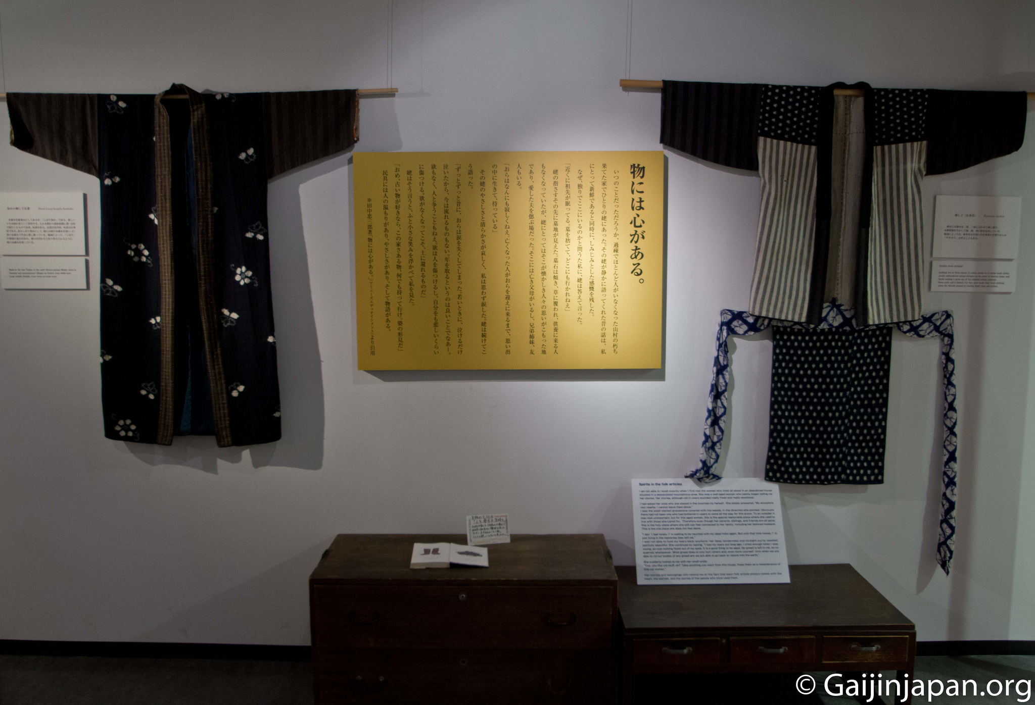 L’aspect majeur de la collection textile exposée sur place est basée sur le concept japonais du « Mottainai » (もったいない– ne pas gâcher). Ceci se ressent au travers des pièces de vêtements exposées sur place et qui, à l’origine, se passaient de génération en génération, au sein de la même famille, et chaque membre y ajoutait une ou plusieurs pièce(s) de tissus afin de rafistoler le vêtement qui s’abimait avec le temps. Ceci a créé des pièces uniques qui aujourd’hui inspirent des grands noms de la mode tel que Louis Vitton.