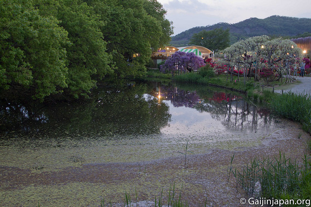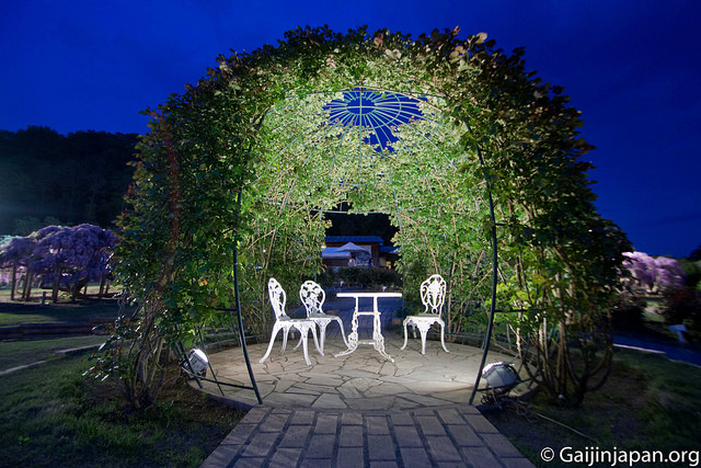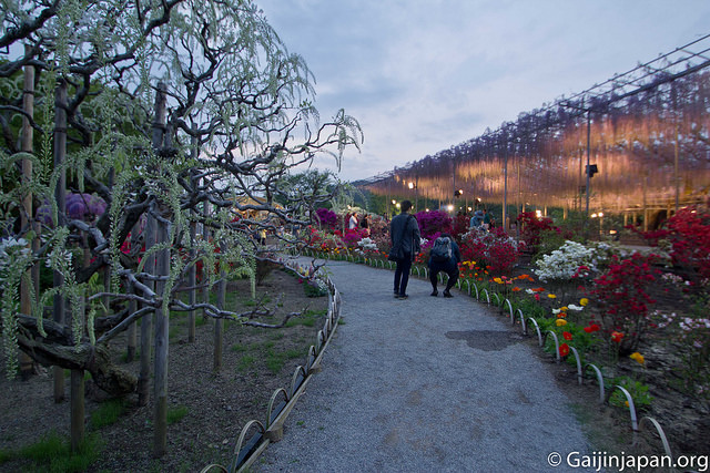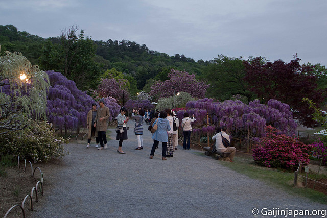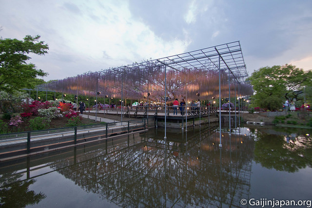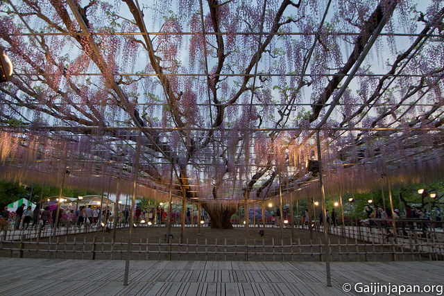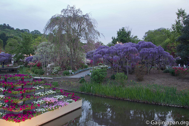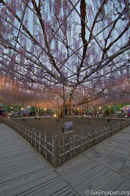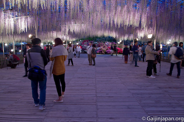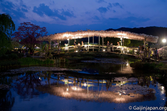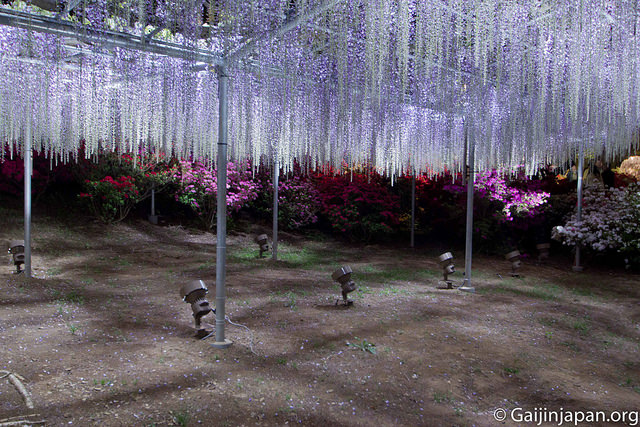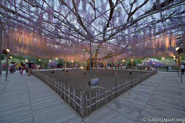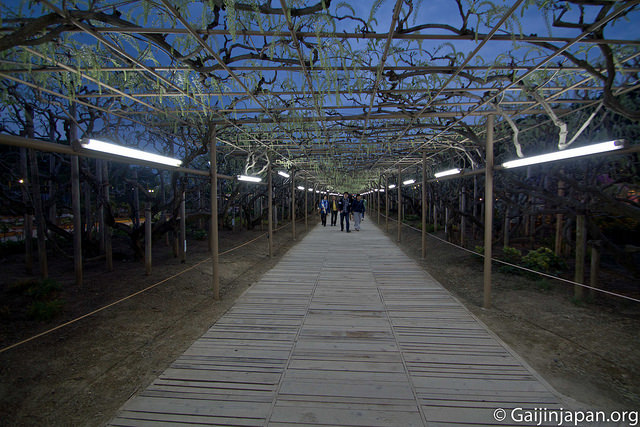 Les glycines en masse et en fleurs offrent définitivement un somptueux spectacle, très coloré, et certaines de ces fleurs atteignent la taille de 180 cm à pleine floraison, ce qui est assez impressionnant lorsque l’on marche juste en-dessous d’un « toit » composé de ces dernières. Autre point fort, le parc propose des illuminations la nuit venue, ce qui donne encore un autre aspects aux glycines et une autre beauté.