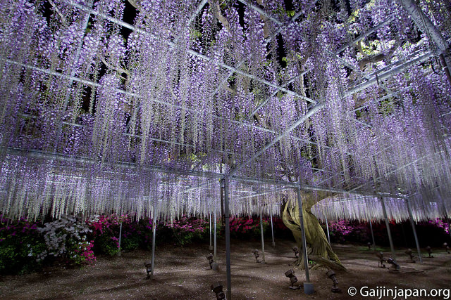 Le Ashikaga Flower Park est l’endroit où se rendre au Japon pour observer les glycines en fleurs, au début du mois de mai, elles qui offrent un somptueux spectacles à tous les visiteurs, nombreux à cette période de l’année.