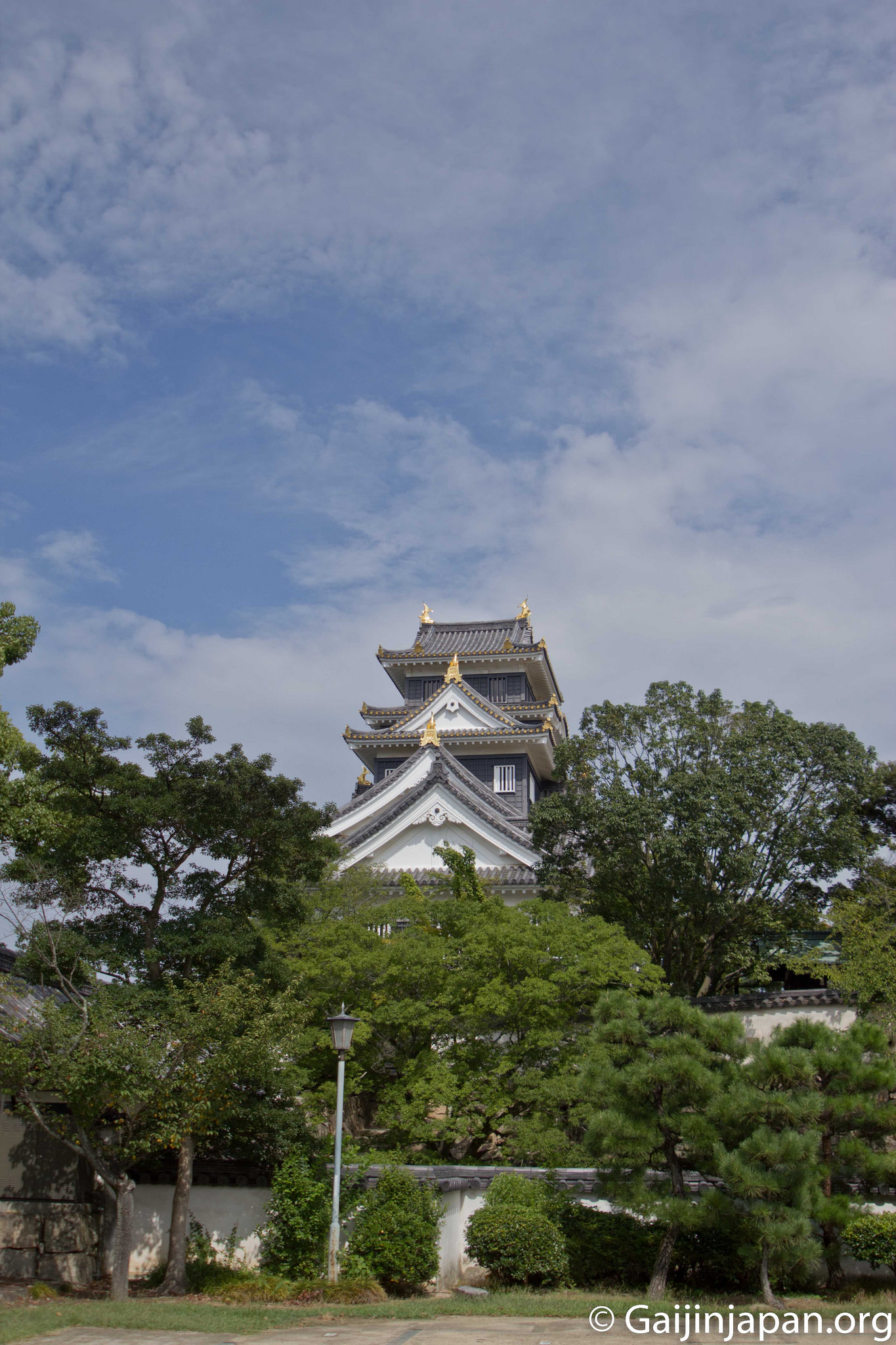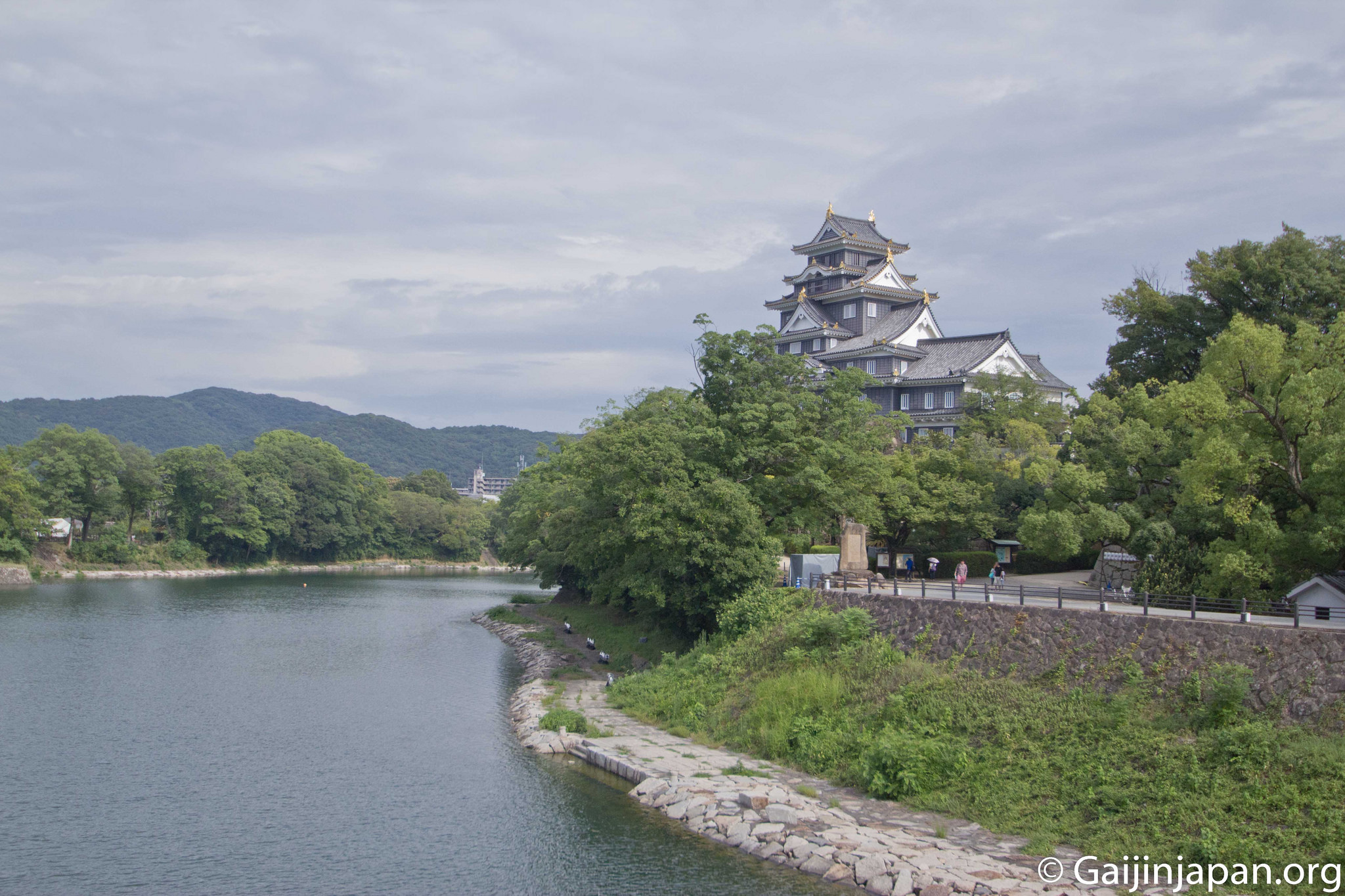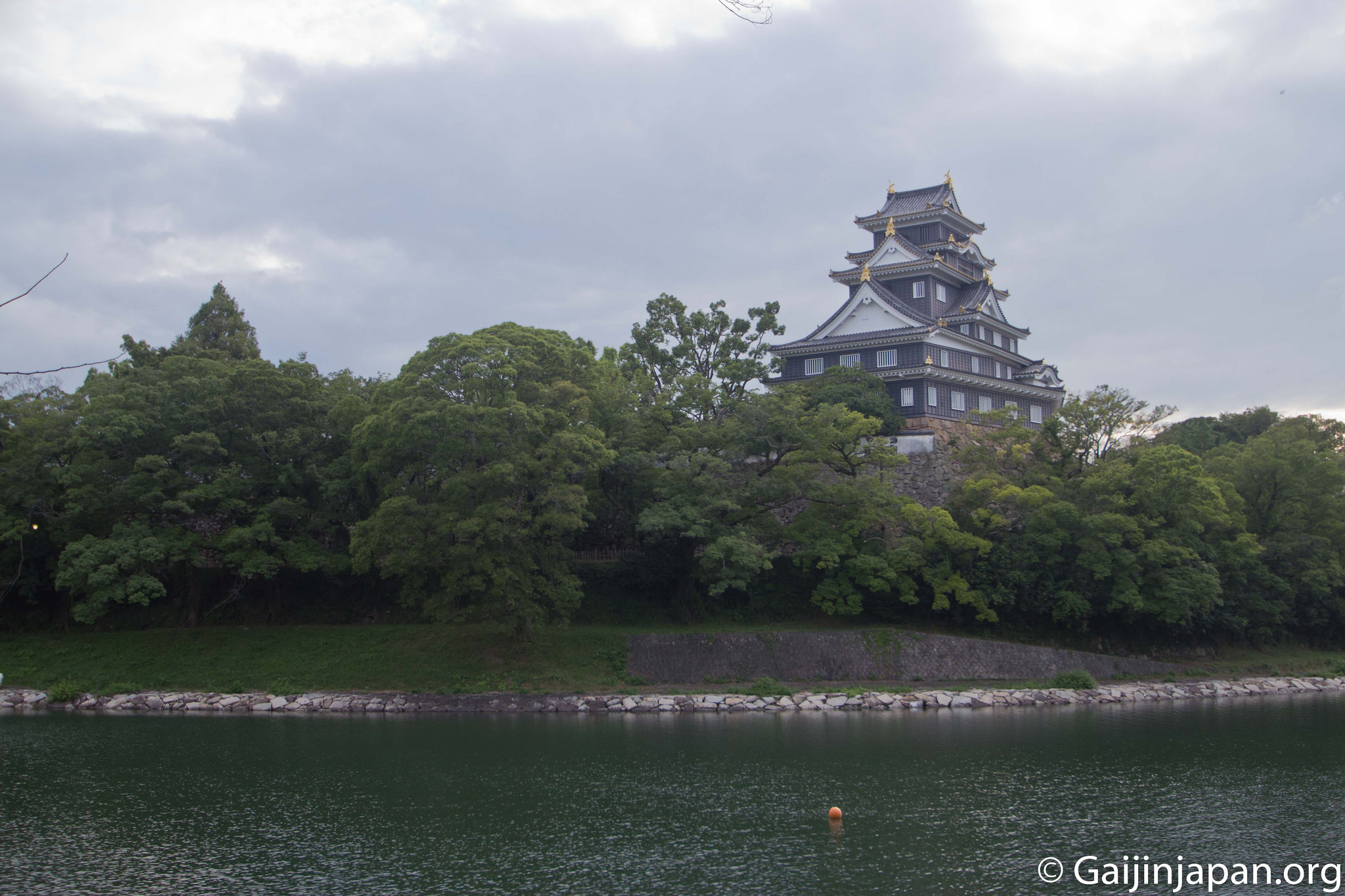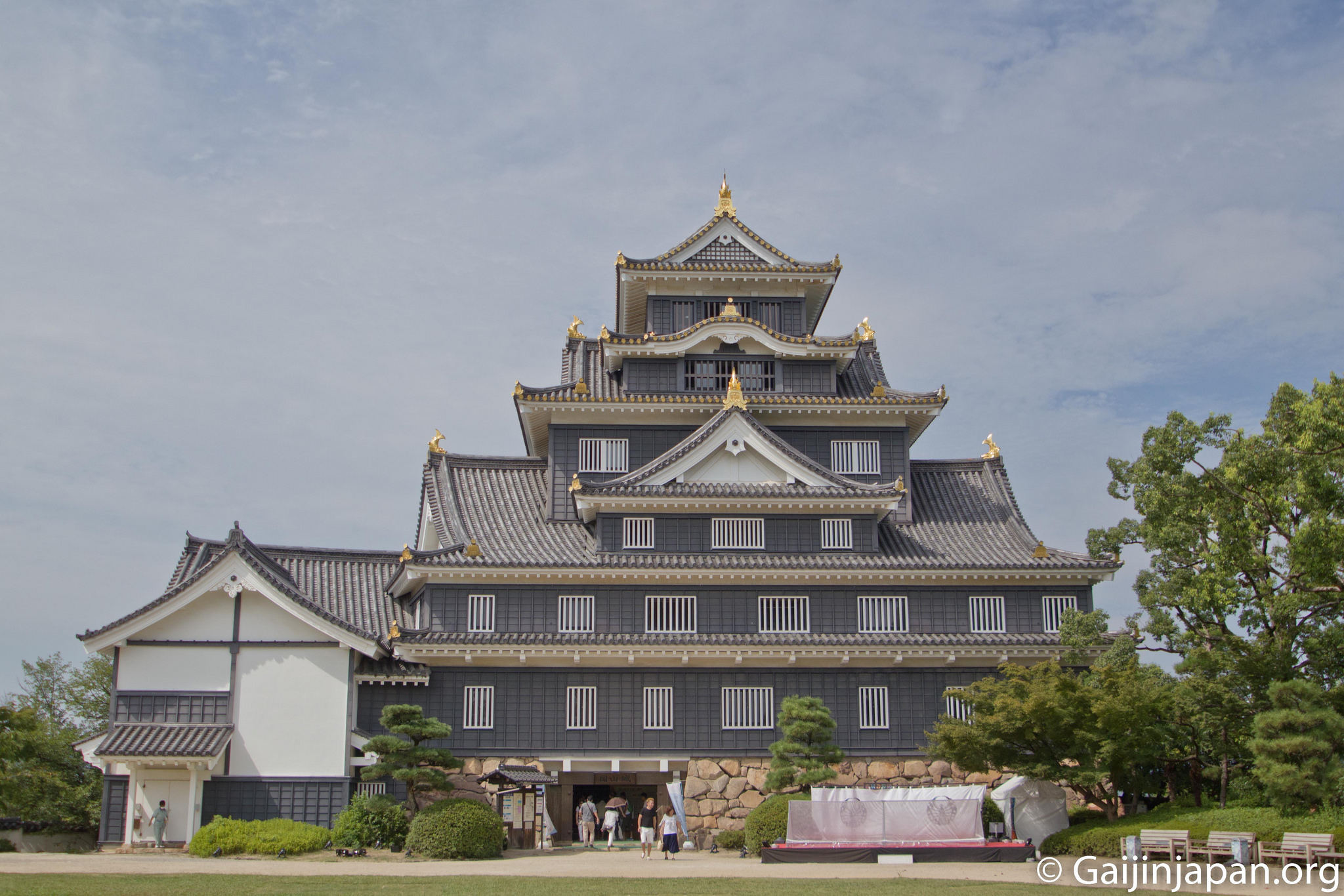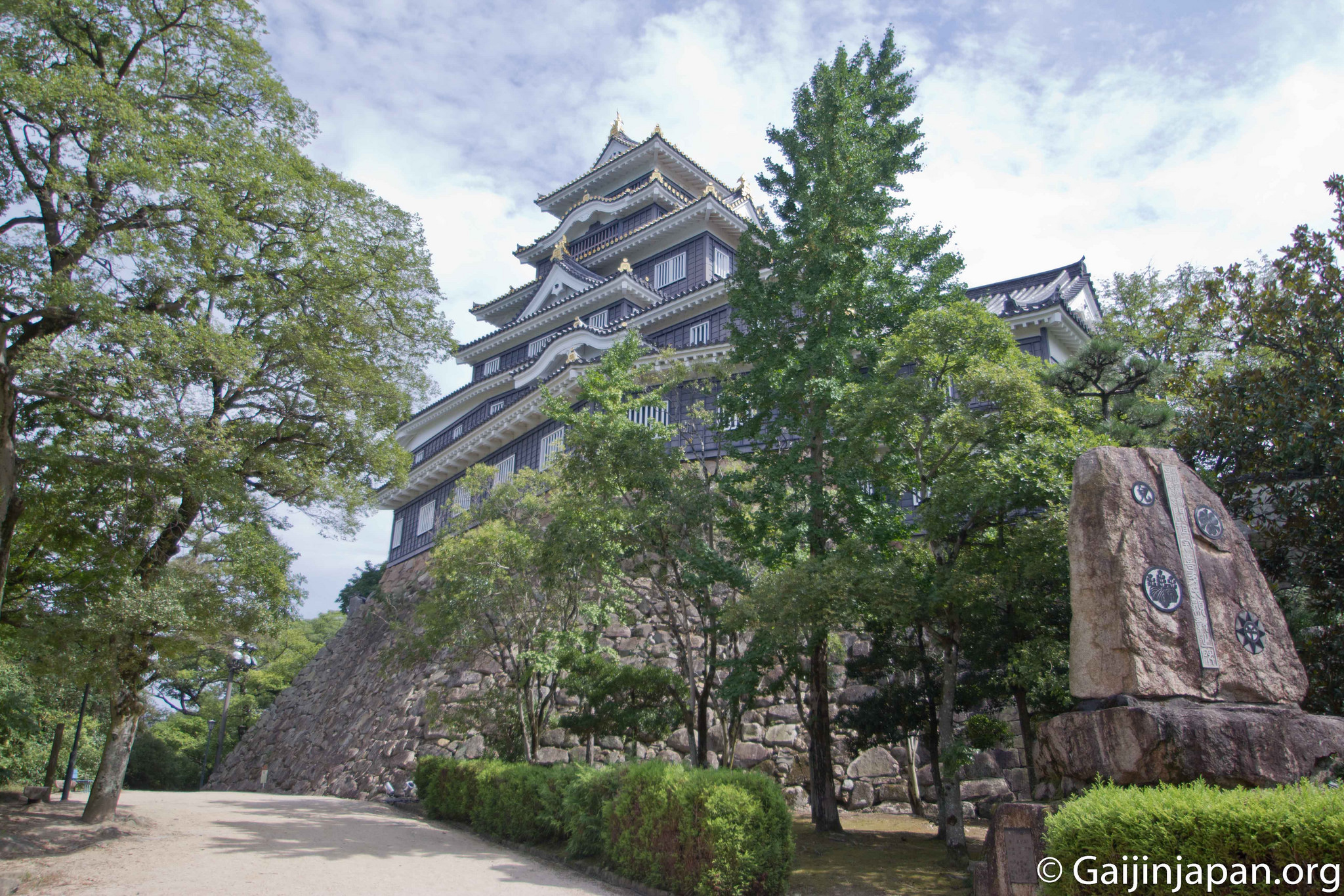 Le Okayama-jo (岡山城) aussi connu sous son surnom de « château du corbeau » du fait de sa couleur noire (il porte le même surnom que le château de Matsumoto), vu sa construction débuter en 1573 à la demande de Naoie Ukia mais il ne sera achevé qu’en 1597 par le fils de ce dernier, Ukita Hideie. Son donjon étant à l’origine couvert de tuiles dorées, il fut à l’époque surnommé le « château du corbeau d’or ».