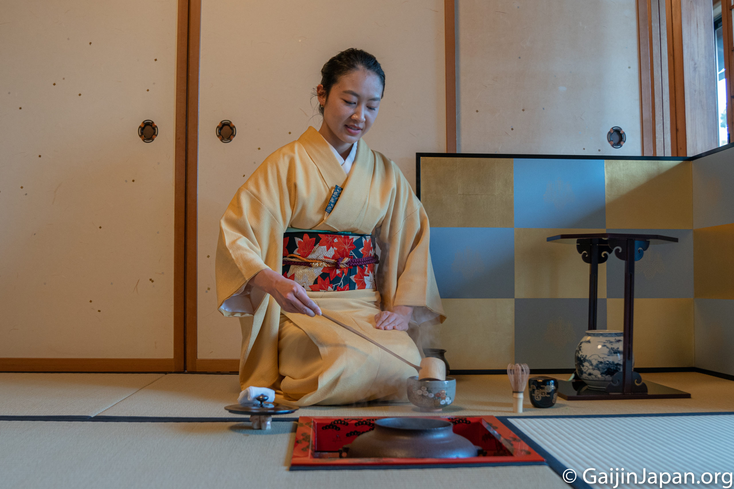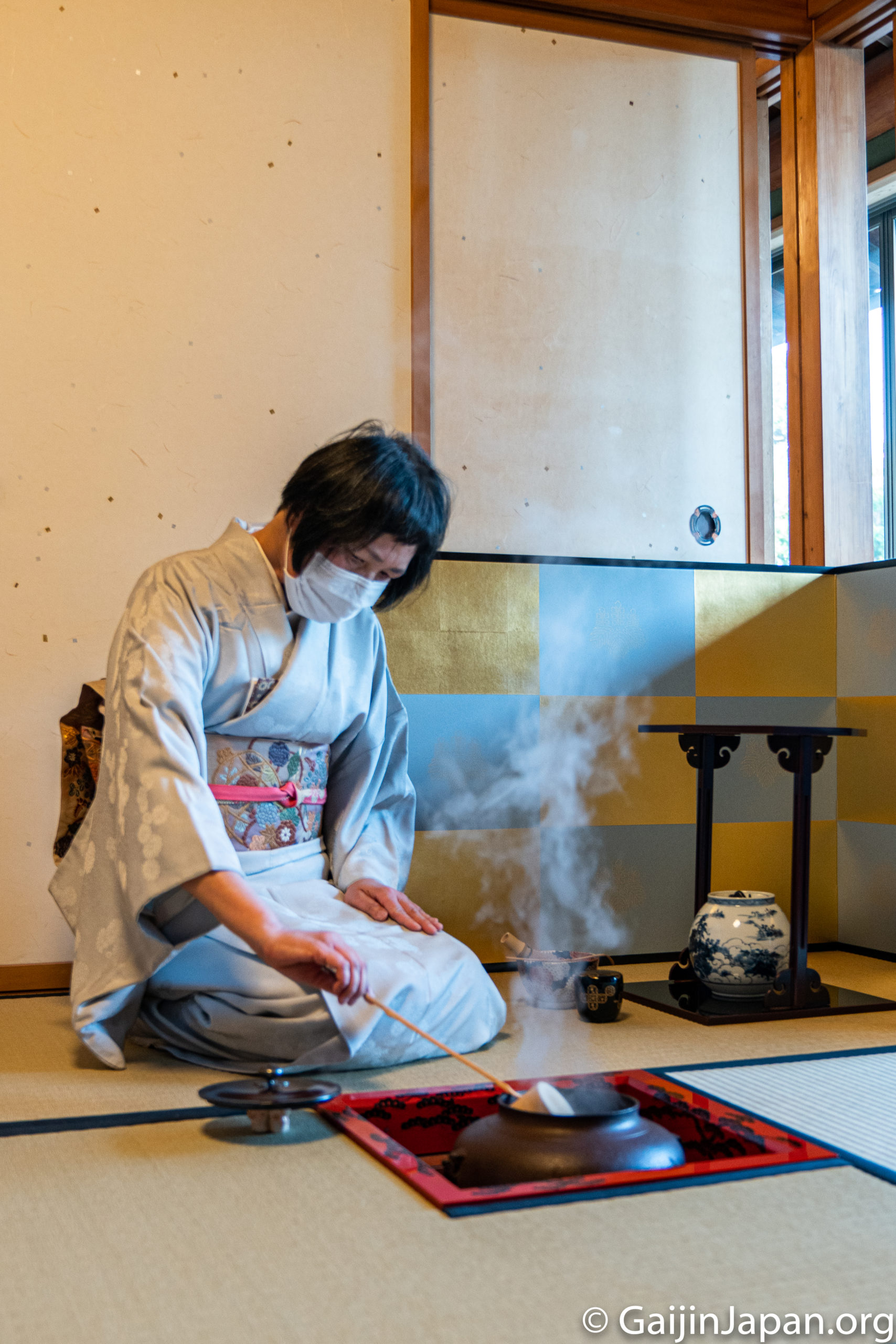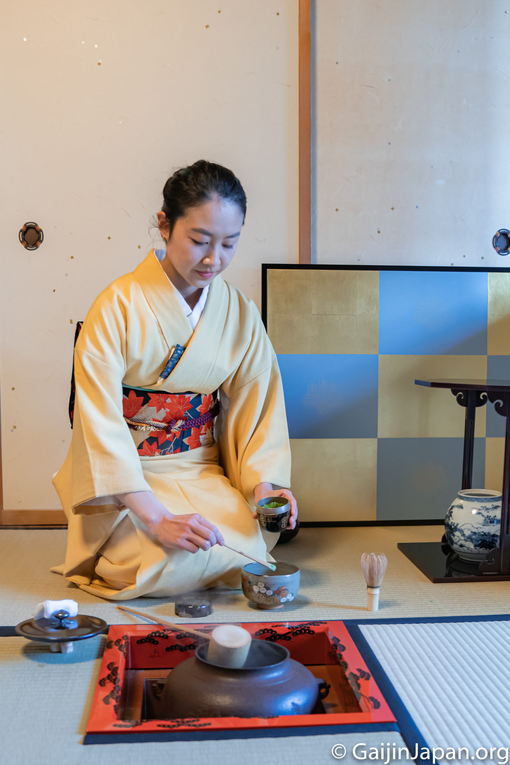 Enfin, j’ai terminé ma journée en visitant un dernier producteur local : Asami-en. Sur place, j’ai eu l’opportunité de participer à une cérémonie du thé. J’en ai déjà fait plusieurs dizaines au Japon et à chaque fois c’est une belle expérience. Ce que j’ai aimé chez Asami-en, c’est le côté chaleureux de la maitresse de cérémonie qui n’hésitait pas à nous mettre à l’aise, à nous faire essayer de réaliser notre bol de matcha, discuter avec nous, rigoler, … c’était convivial et ludique. En plus on pouvait admirer les champs de thé avec le soleil couchant et ses lumières orangées.