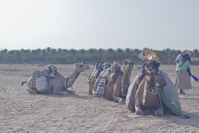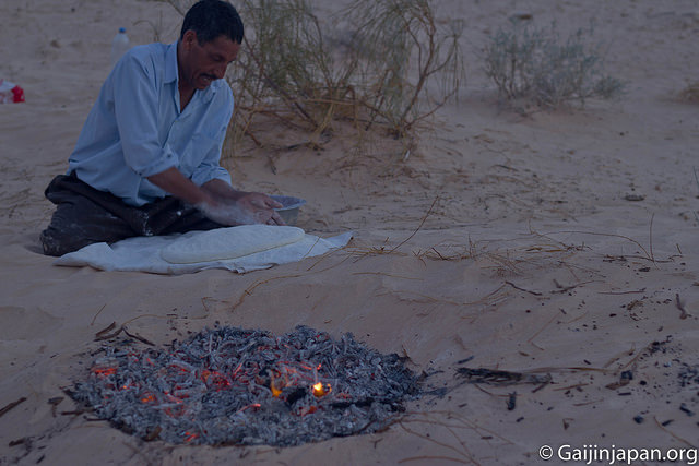 Et ce sentiment de joie s’est installé le soir venu, lorsqu’en plein désert, seul avec nos deux guides, nous avons passé la nuit à la belle étoile, sans même dormir dans nos tentes, à admirer la lune et les étoiles. Le matin, nous avons pu admirer le lever du soleil pendant que notre guide nous préparait du pain à même le sable. Là, ma belle mère se tourna vers moi et me dit « à la télé au Japon j’avais vu une émission où ils montraient un bédouin préparer du pain de la sorte, et aujourd’hui je le vois de mes propres yeux ». L’expérience désert fut une excellente réussite qui plu à tout le monde, surtout ma femme qui ne demande qu’à y retourner.