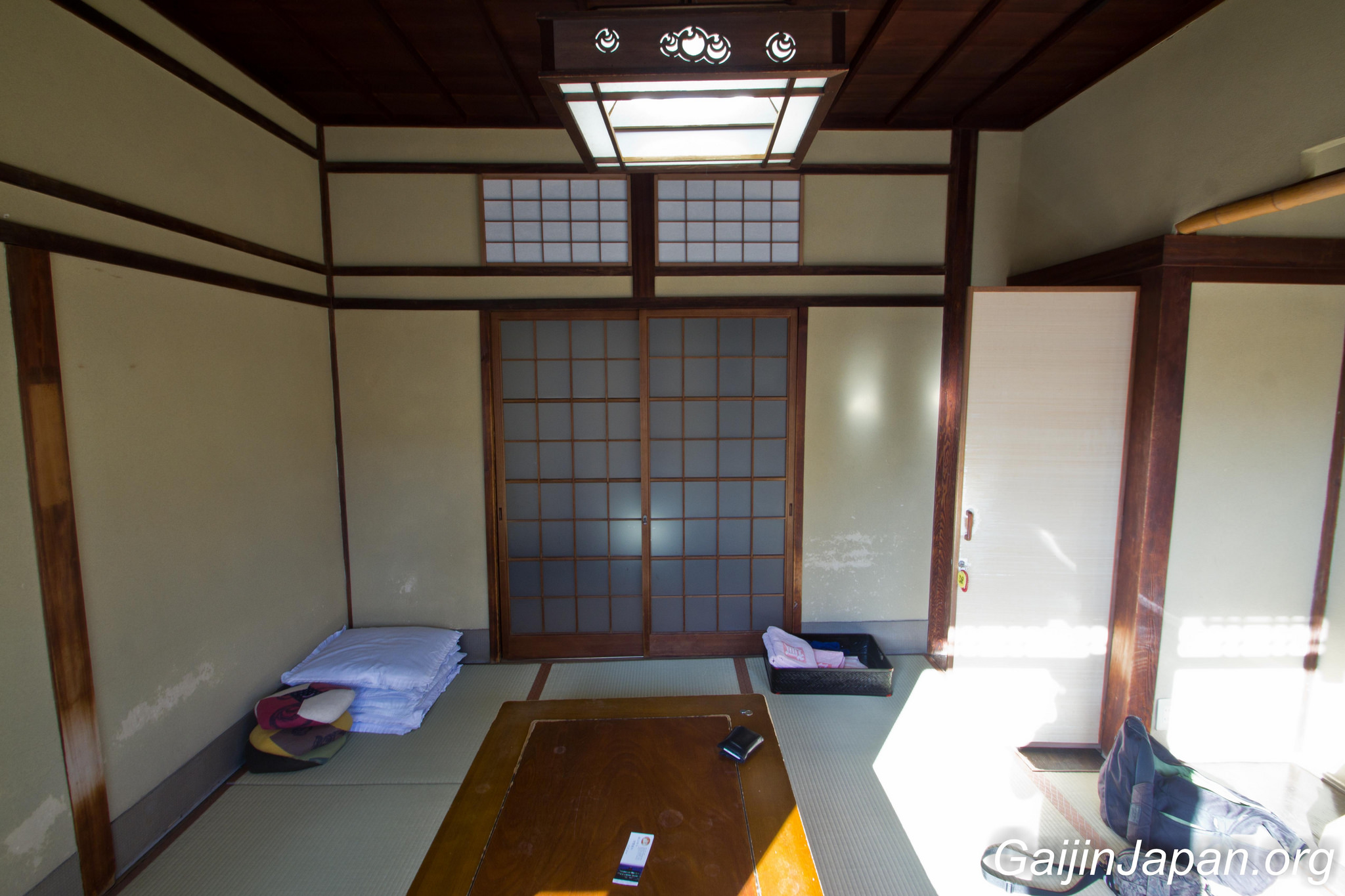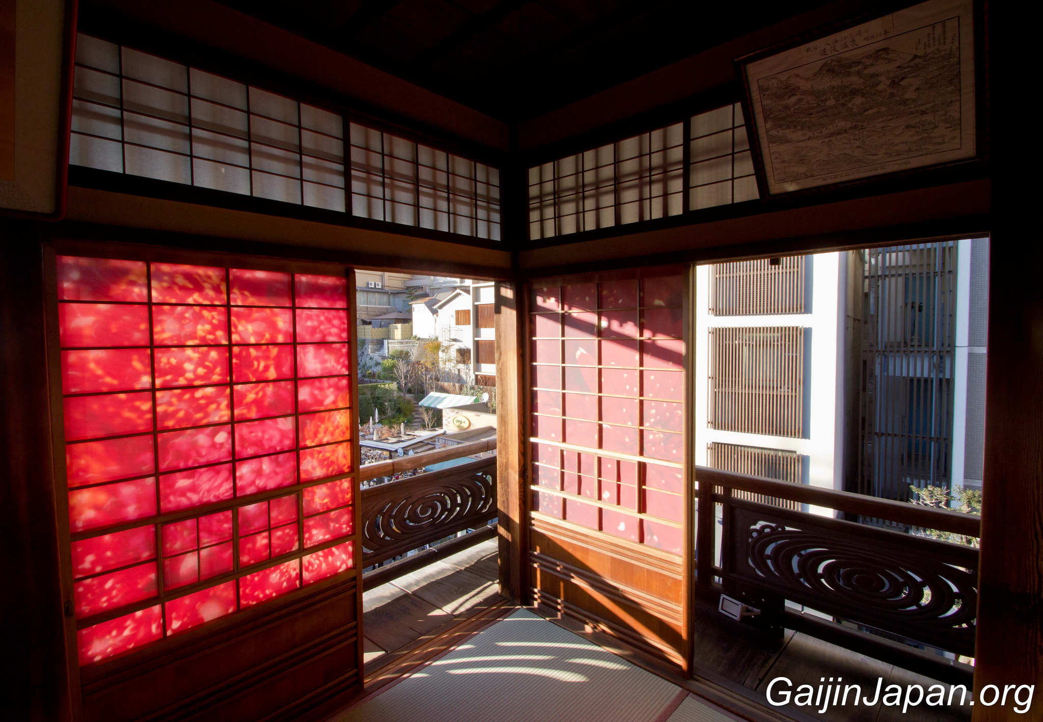 Une fois à l’intérieur du bâtiment on se rend vite compte qu’il s’agit là d’un véritable labyrinthe où l’on pourrait se perdre en explorant, montant et descendant les divers escaliers étriqués tout en bois, et en marchant sur les tatamis. Le rez-de-chaussée est là où se trouvent l’accueil et le bain le plus « populaire » tandis que le deuxième étage accueille la salle de repos commune et le second bain, et enfin le troisième étage accueille les salles de repos privatives et une salle dédiée à Botchan et son auteur. L’annexe Yushinden est elle accessible, pour les détenteurs d’un ticket, depuis le deuxième étage, à condition d’être accompagné par un guide.