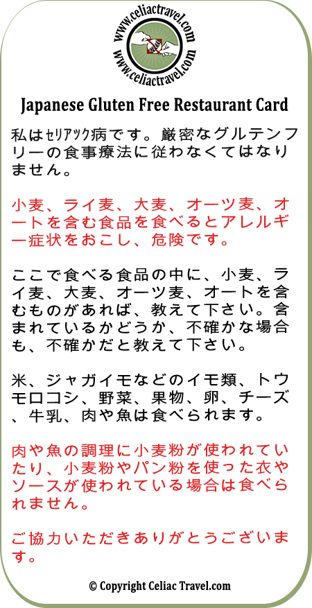 Si vous allez manger dans un restaurant au Japon, sachez que les restaurateurs prennent très au sérieux les questions d’allergies et que si vous leur signalez ceci, ils feront tout leur possible pour ne pas vous servir quelque chose d’inadapté à votre condition. Et, si vous ne pouvez pas consommer de Gluten, CeliacTravel à conçu des cartes, en plusieurs langues, avec les instructions concernant la non consommation de Gluten et que vous pouvez simplement présenter au restaurant. Vous pouvez la télécharger par ici en français et japonais.