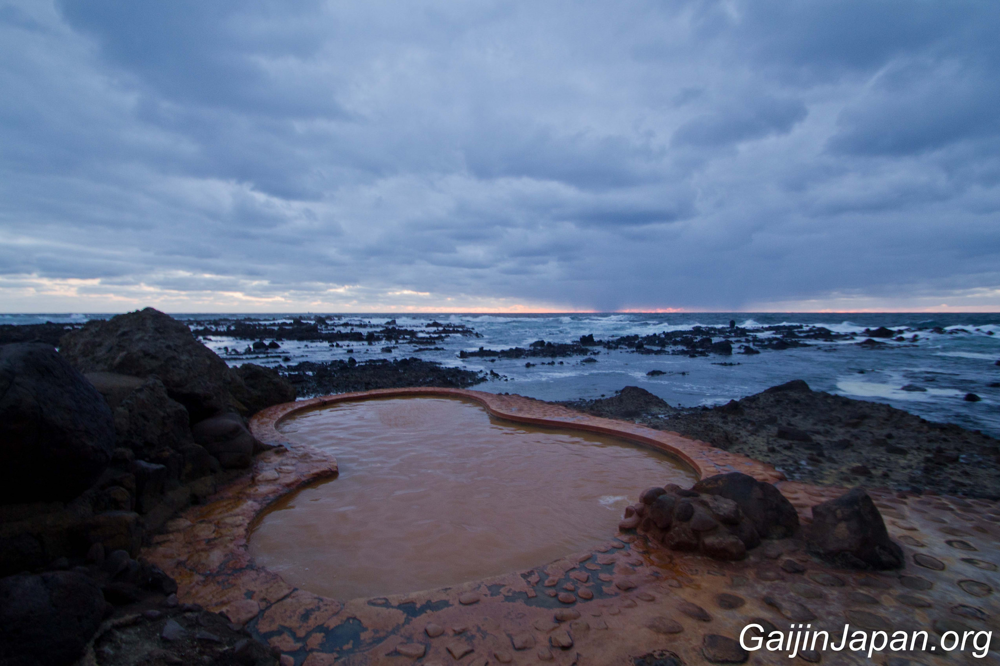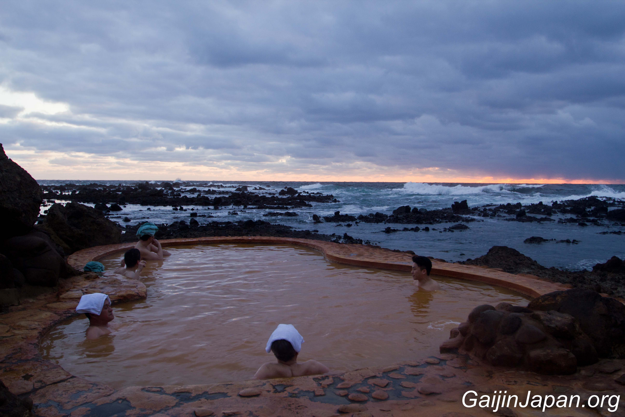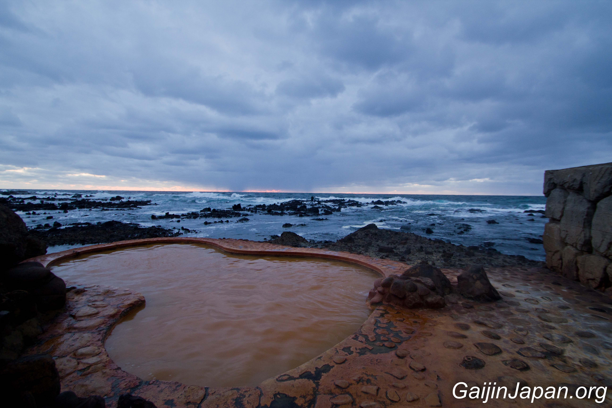 Il est composé de deux bains, l’un étant réservé exclusivement aux femmes et l’autres étant mixte, en extérieur et qui donne une vue imprenable sur la mer du Japon, notamment lors du coucher du soleil. La couleur ocre des bains peut en refouler certains, au premier abord, mais elle est due au fer oxydé provenant des profondeurs du sol, celui-là même qui confère ses bienfaits à ce bain naturel.