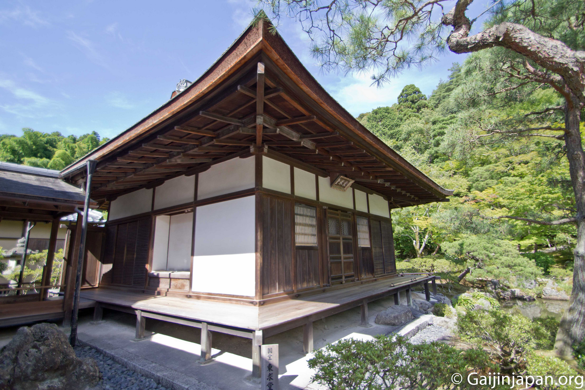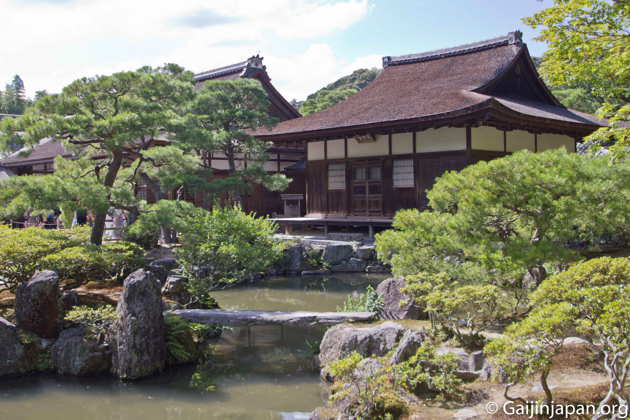 Alors que Kyoto se relève à peine de la guerre d’Onin (1467-1477), qui a littéralement détruit des pans entiers de la ville, Ashikaga Yoshimasa, alors 8ème Shogun, décide de faire construire une villa pour sa retraite, en se basant sur le modèle de son grand-père Ashikaga Yoshimitsu qui à son époque avait fait construire le Kinkaku-ji. Cette villa s’appellera « Higashiyama Dono ». C’est en 1482 que ce nouvel édifice fut construit.