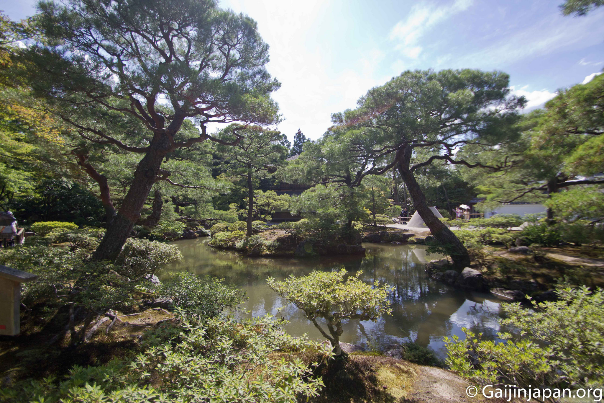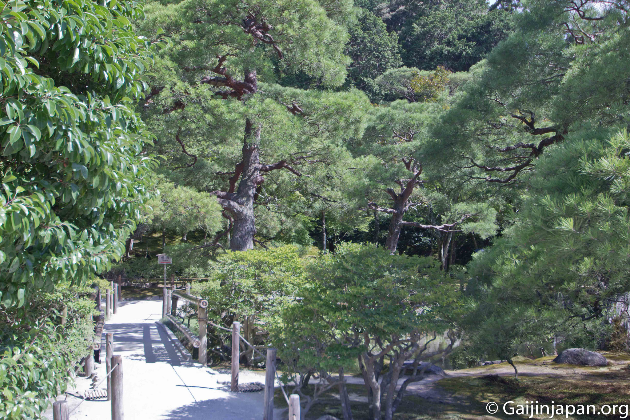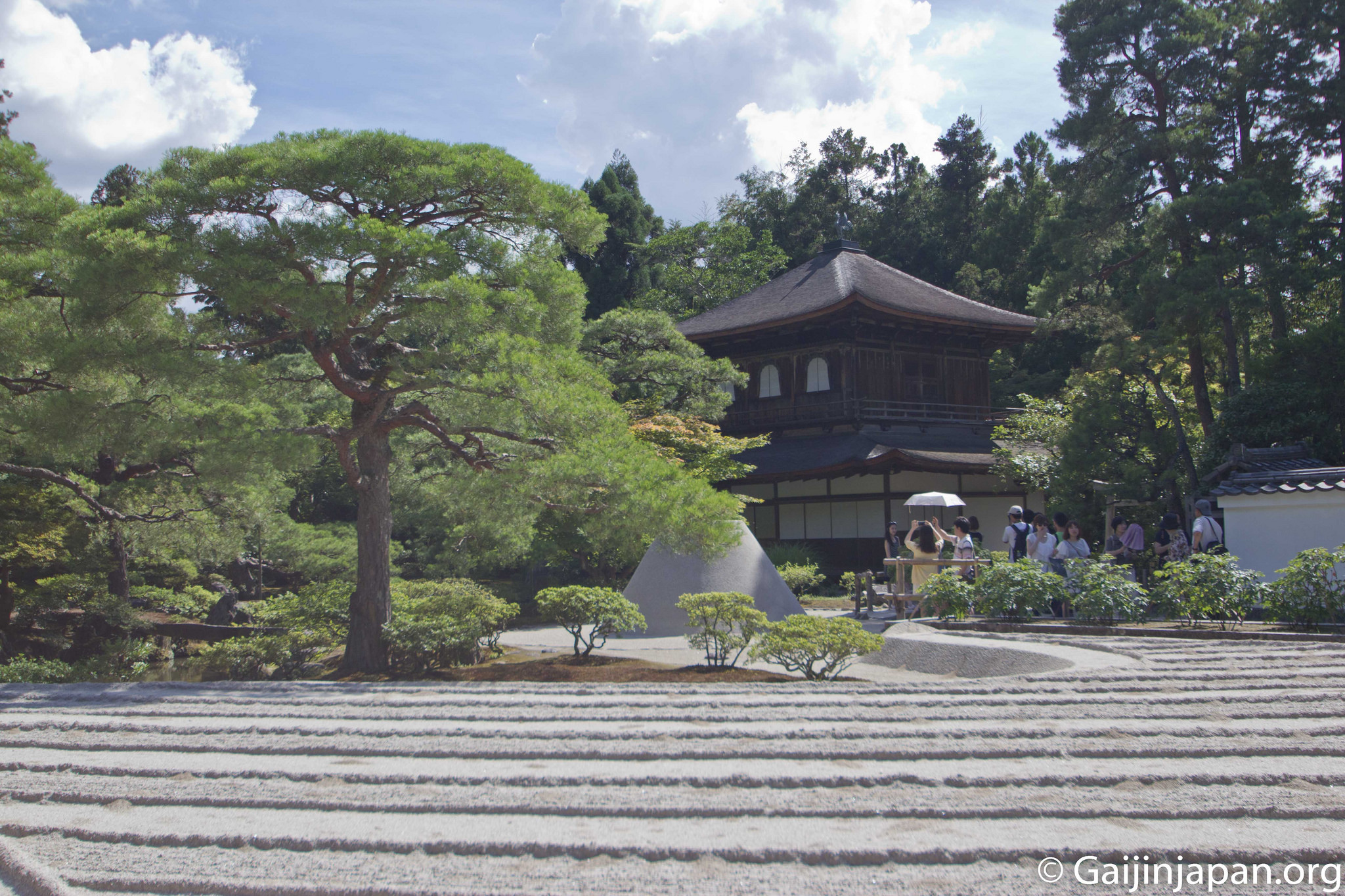 Dès l’entrée, le Kannonden (le pavillon d’argent), qui renferme une statue de Kannon, accueille les visiteurs sur la droite. Puis vient un grand jardin sec de sable et gravier méticuleusement entretenu et surnommé « la mer de sable argenté ». On peut y voir une butte conique de sable nommée « plateforme de vue sur la lune » d’une hauteur de deux mètres environ, et que certains comparent au Mont Fuji. Juste à côté de celui-ci se trouve le « Hondo » (hall principal).