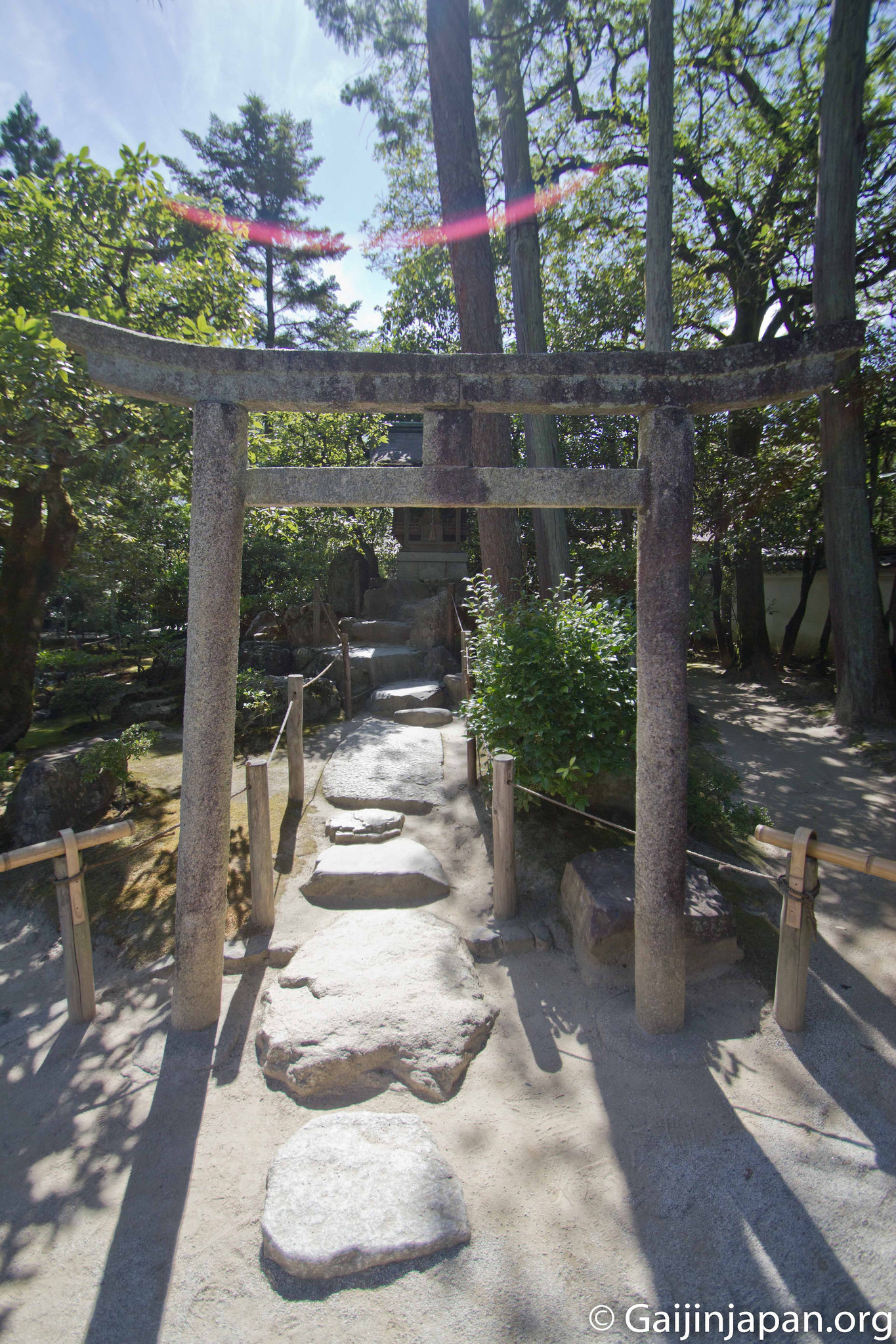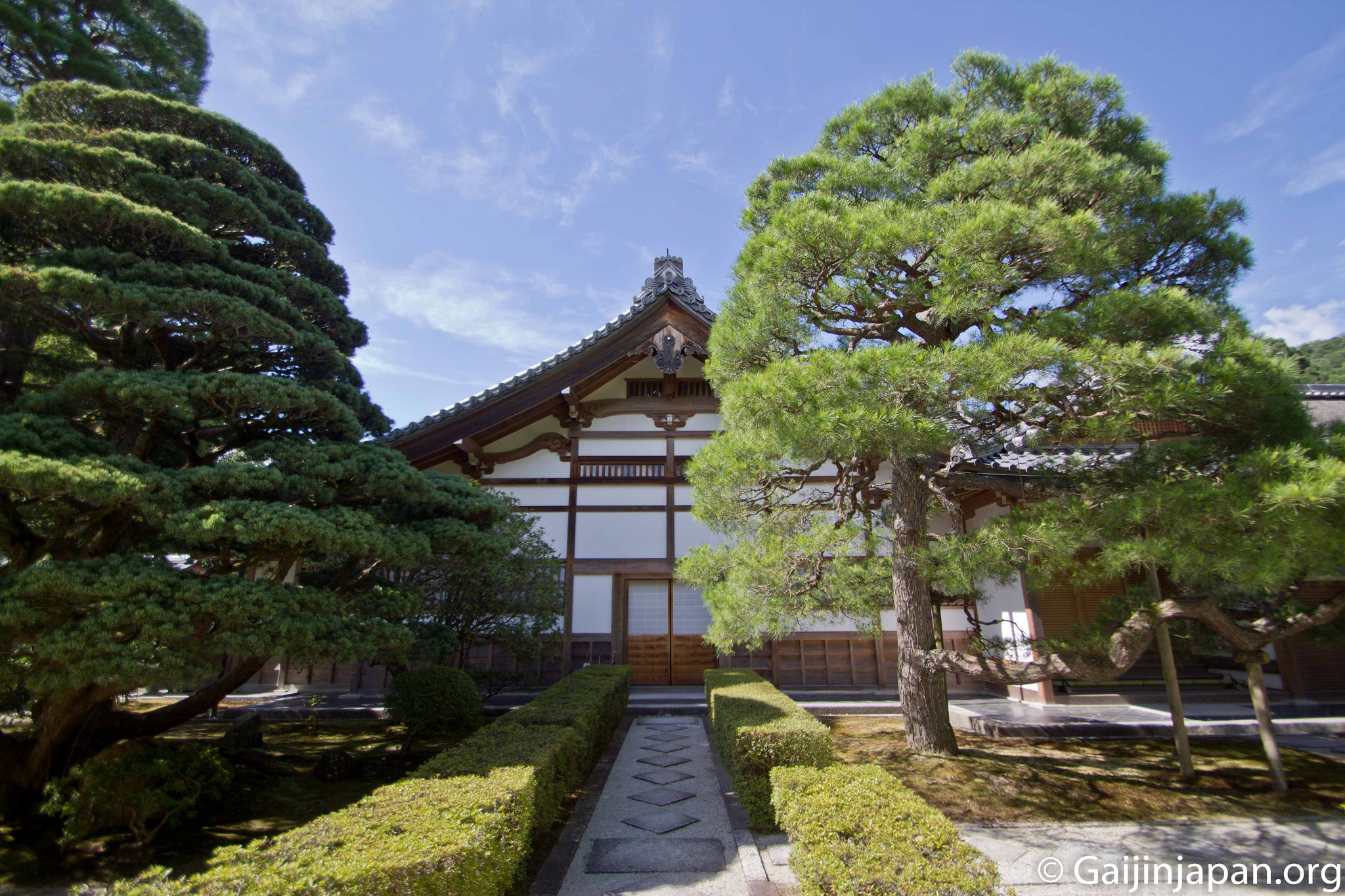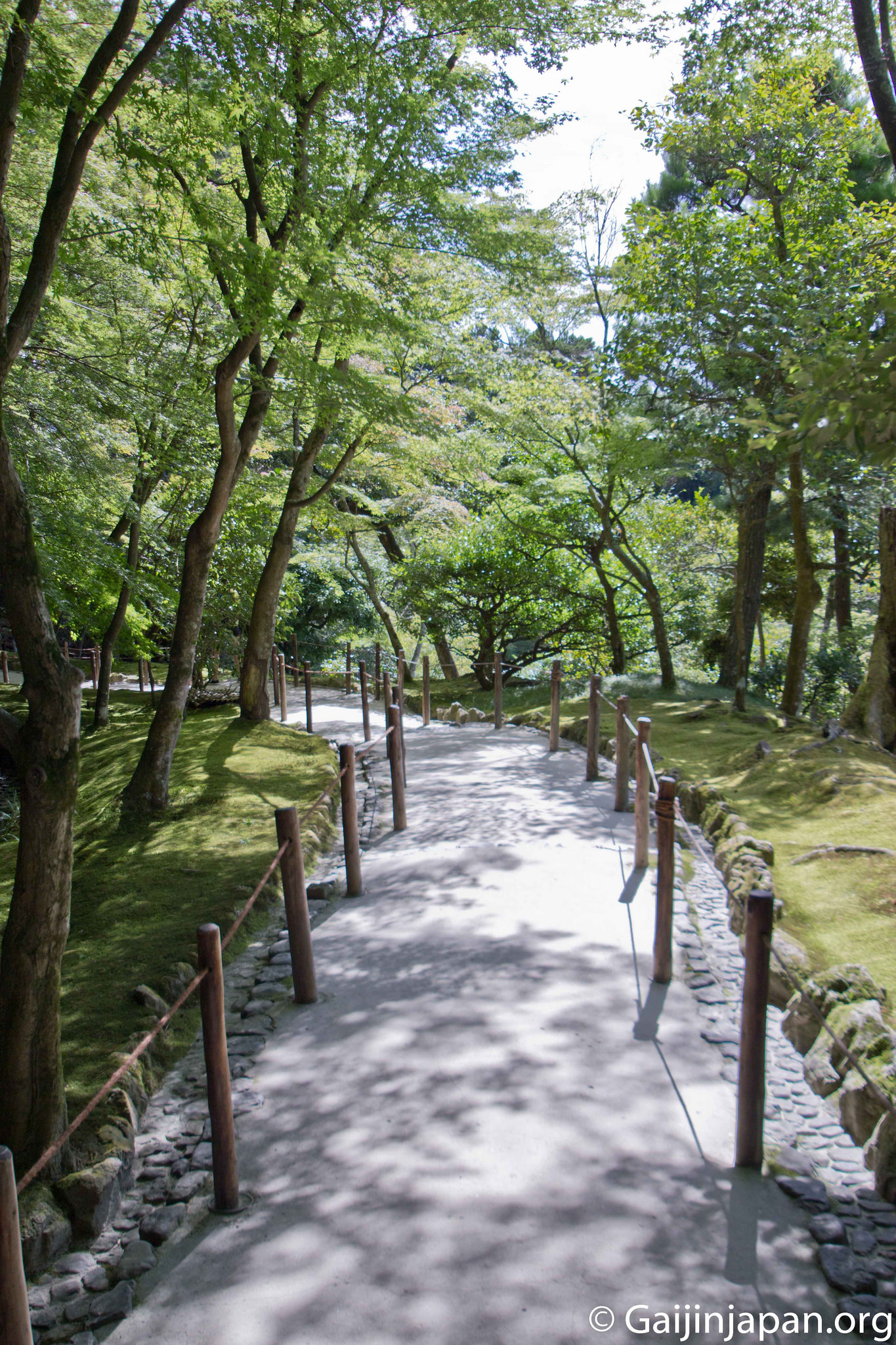 Dès l’entrée, le Kannonden (le pavillon d’argent), qui renferme une statue de Kannon, accueille les visiteurs sur la droite. Puis vient un grand jardin sec de sable et gravier méticuleusement entretenu et surnommé « la mer de sable argenté ». On peut y voir une butte conique de sable nommée « plateforme de vue sur la lune » d’une hauteur de deux mètres environ, et que certains comparent au Mont Fuji. Juste à côté de celui-ci se trouve le « Hondo » (hall principal).