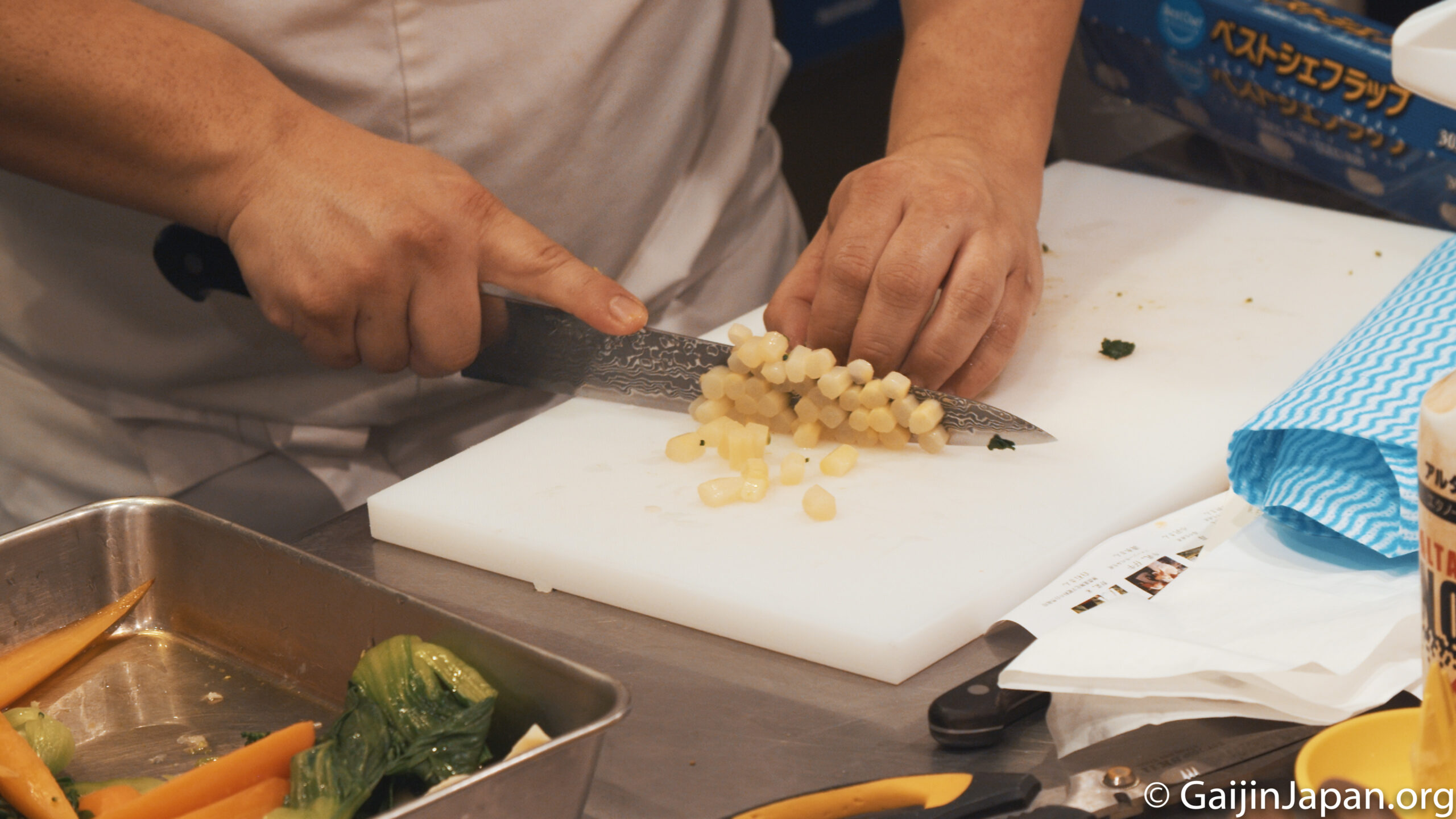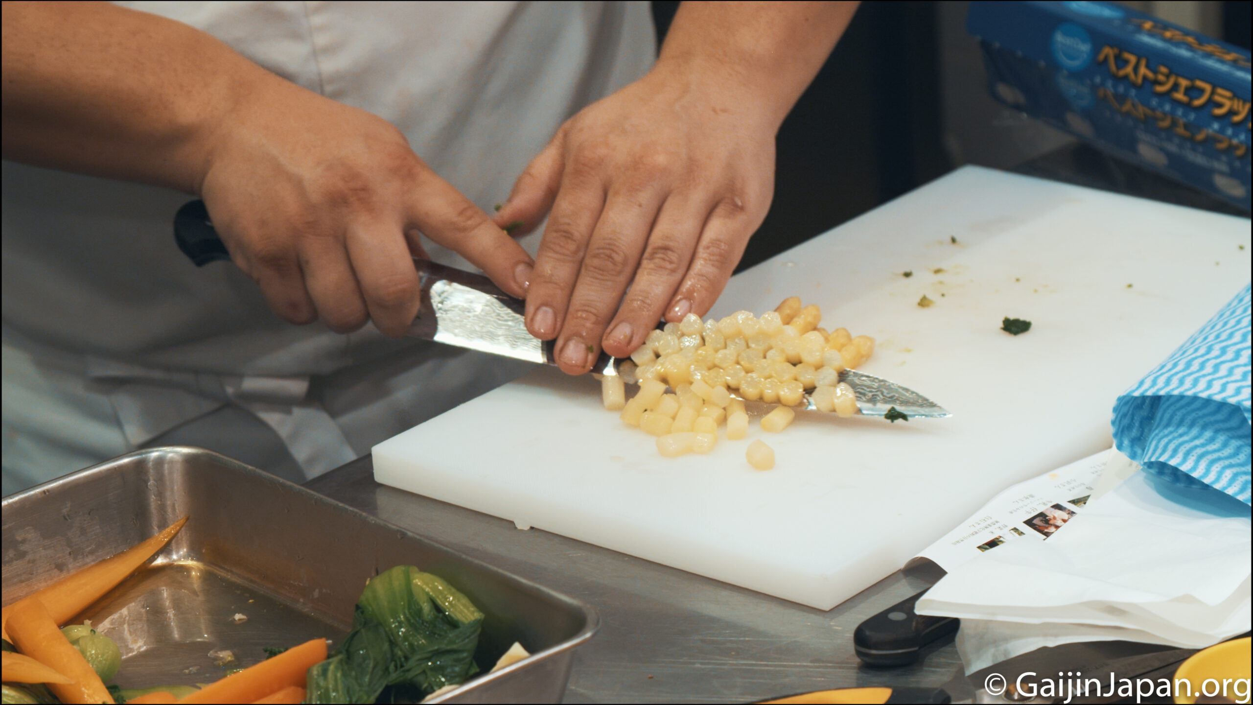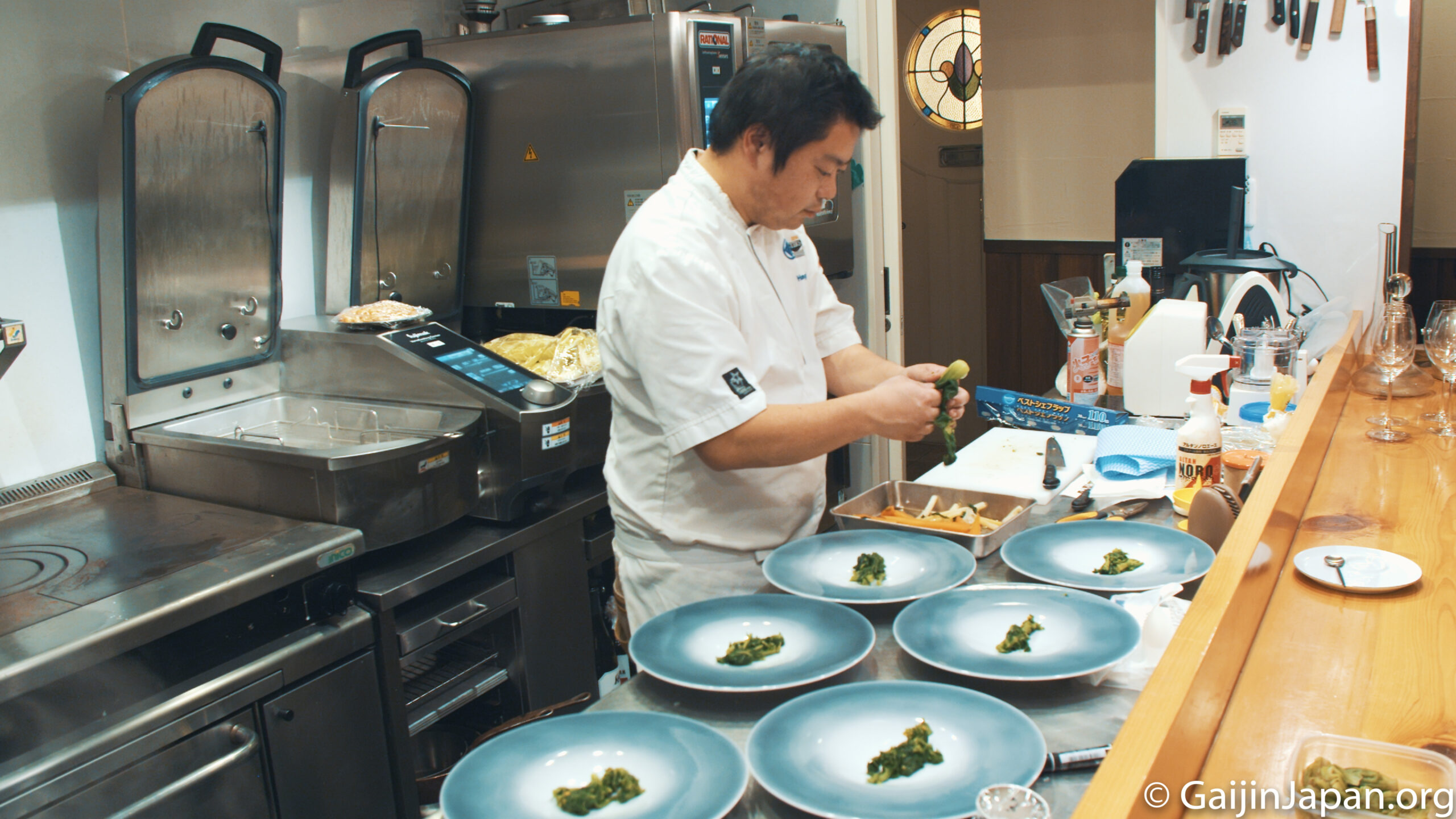 Ensuite, une fois les « courses » terminées, il va rentrer dans son restaurant et composer son menu en fonction des légumes à sa disposition. Alors qu’avant le séisme du 11 mars 2011 il ne pensait que les légumes n’étaient qu’un ingrédient parmi d’autres, aujourd’hui tous ses plats se font en fonction de ceux-ci. Ainsi, il choisira les viandes et poissons en fonctions des légumes du jour. Et ceci lui permet de proposer des plats aux ingrédients du jour, ultra-frais.