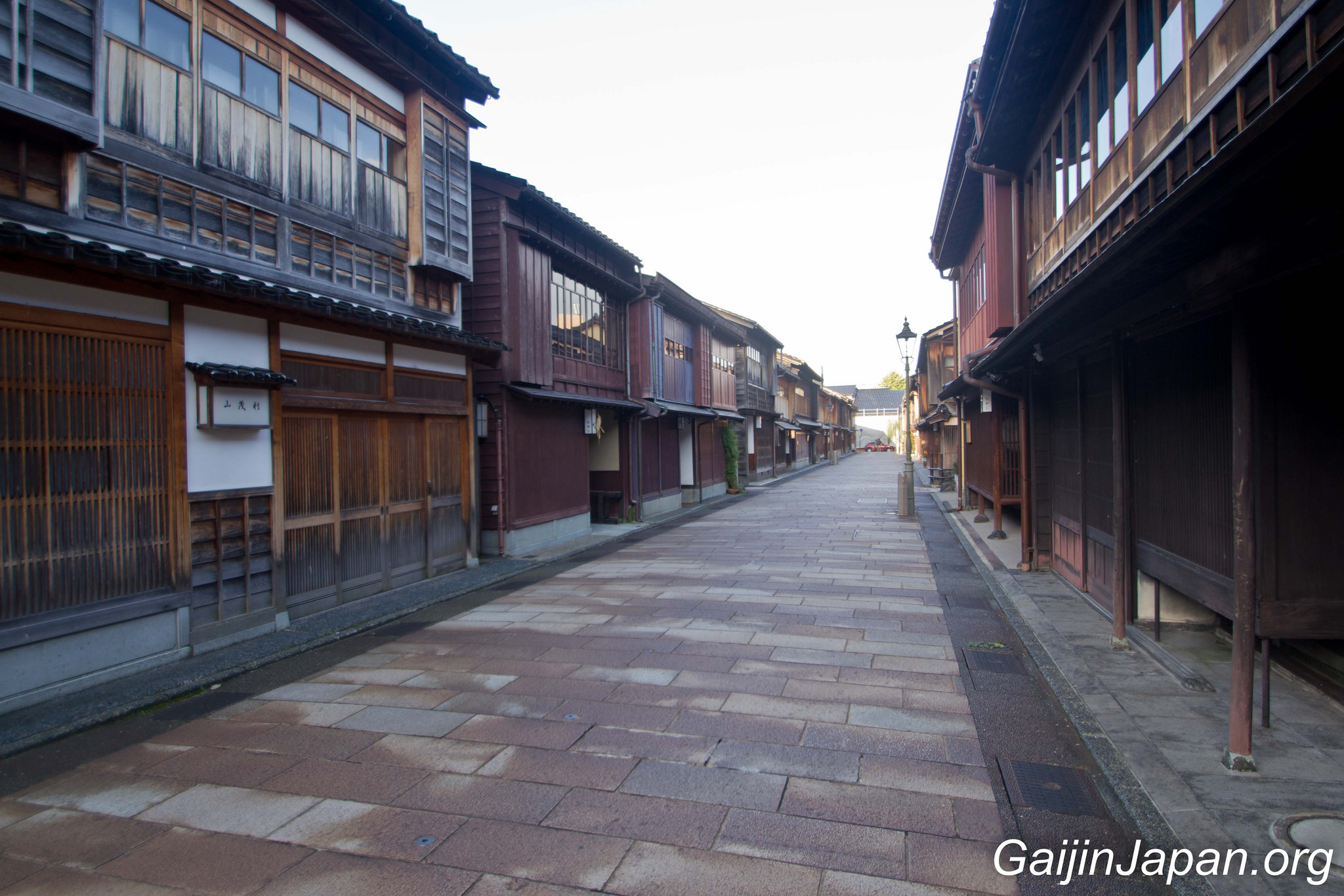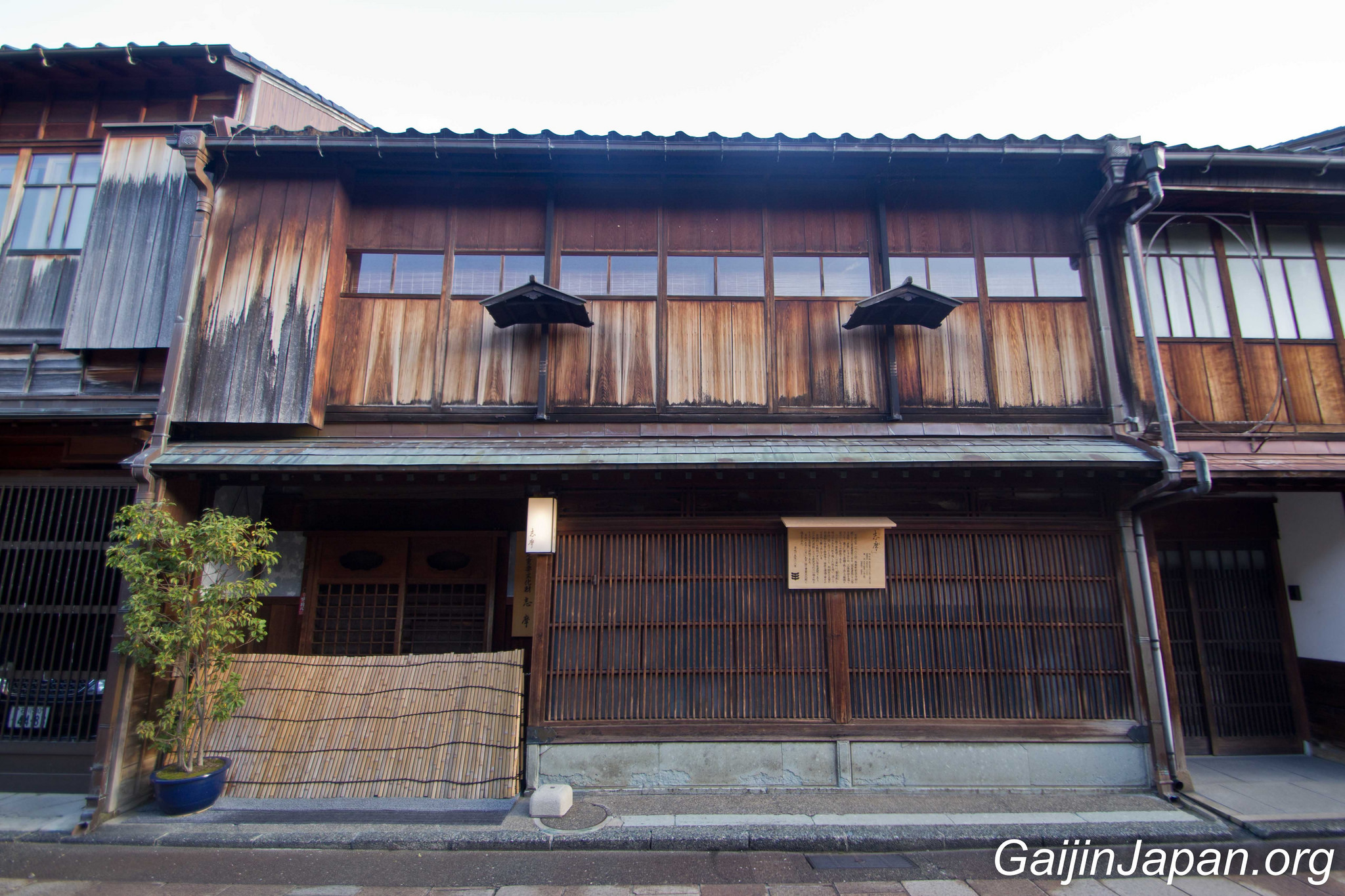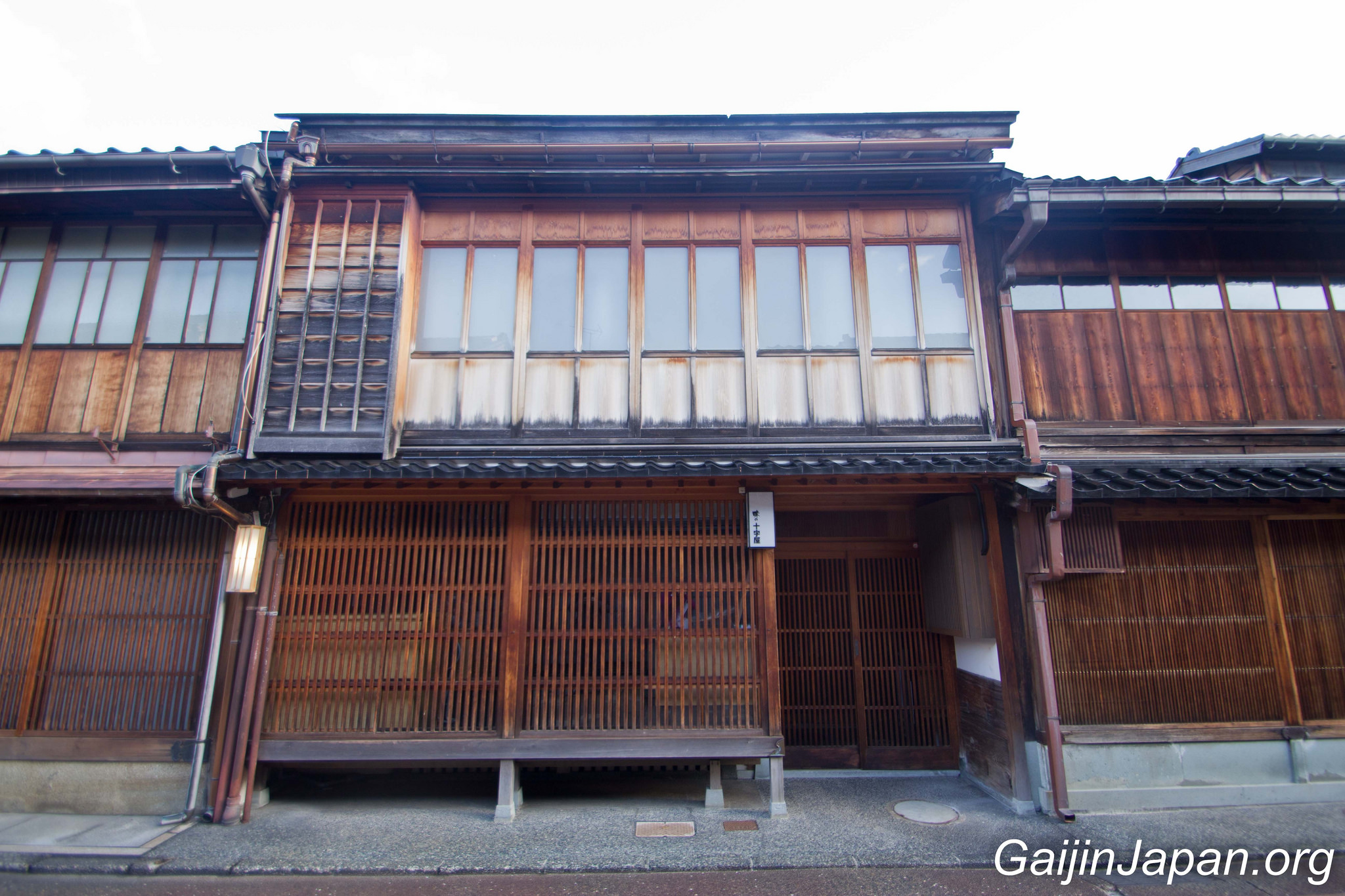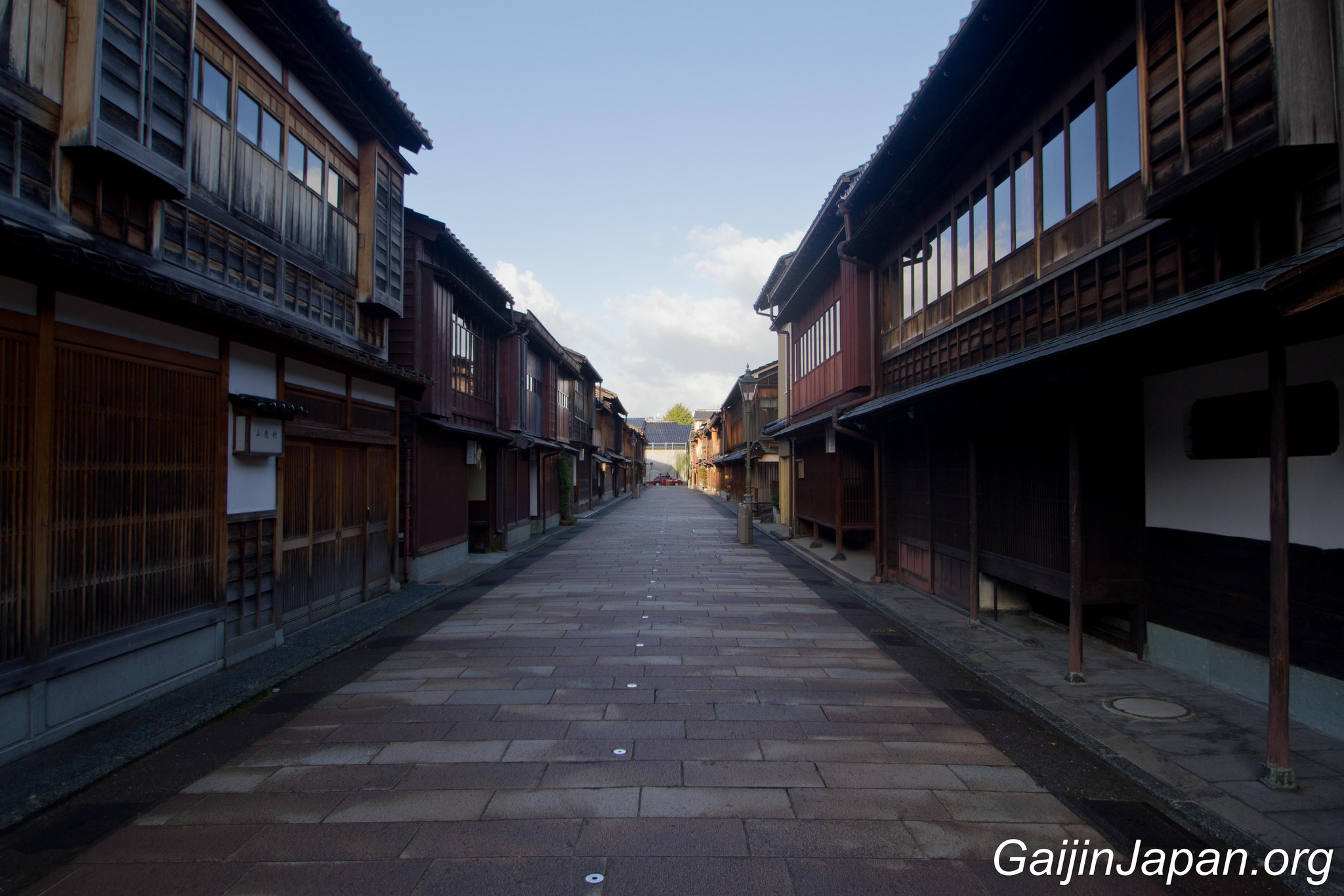 Durant l’époque Edo, il y avait des Chaya à Kanazawa, un peu de partout, parsemé dans la ville. Puis, en 1820 elles ont été réunies en quatre quartiers différents, éloignés du centre de la ville. Le plus grand de ces quartiers n’était autre que Higashi Chaya Gai (東茶屋街). Il consiste en une allée principale où sont alignées, face à face, de nombreuses Chaya avec leur façade en bois composée d’une partie appelée « Kimusuko », des croisillons en bois.