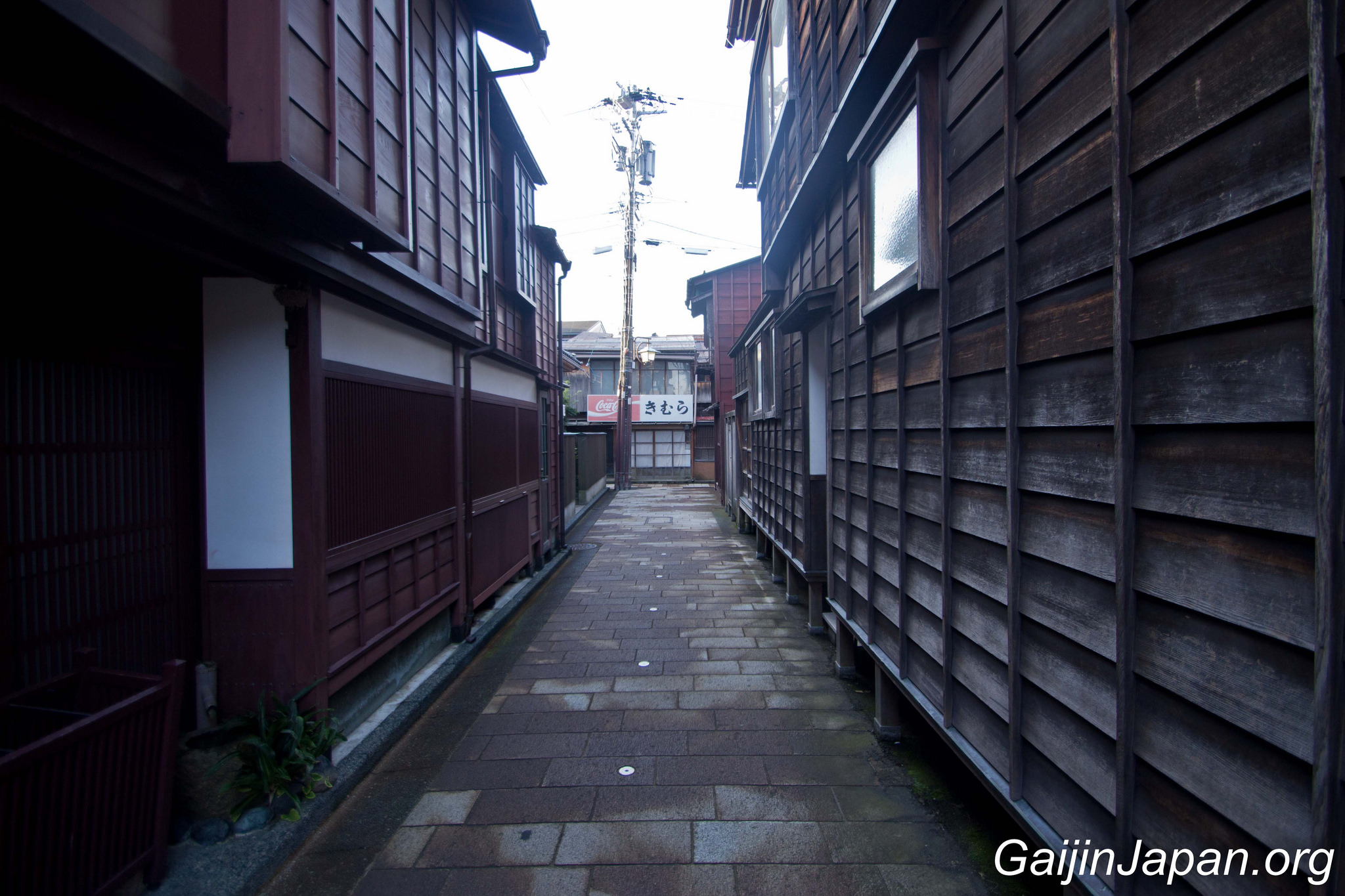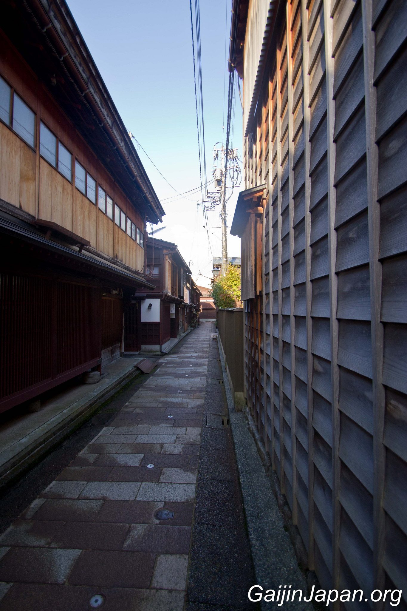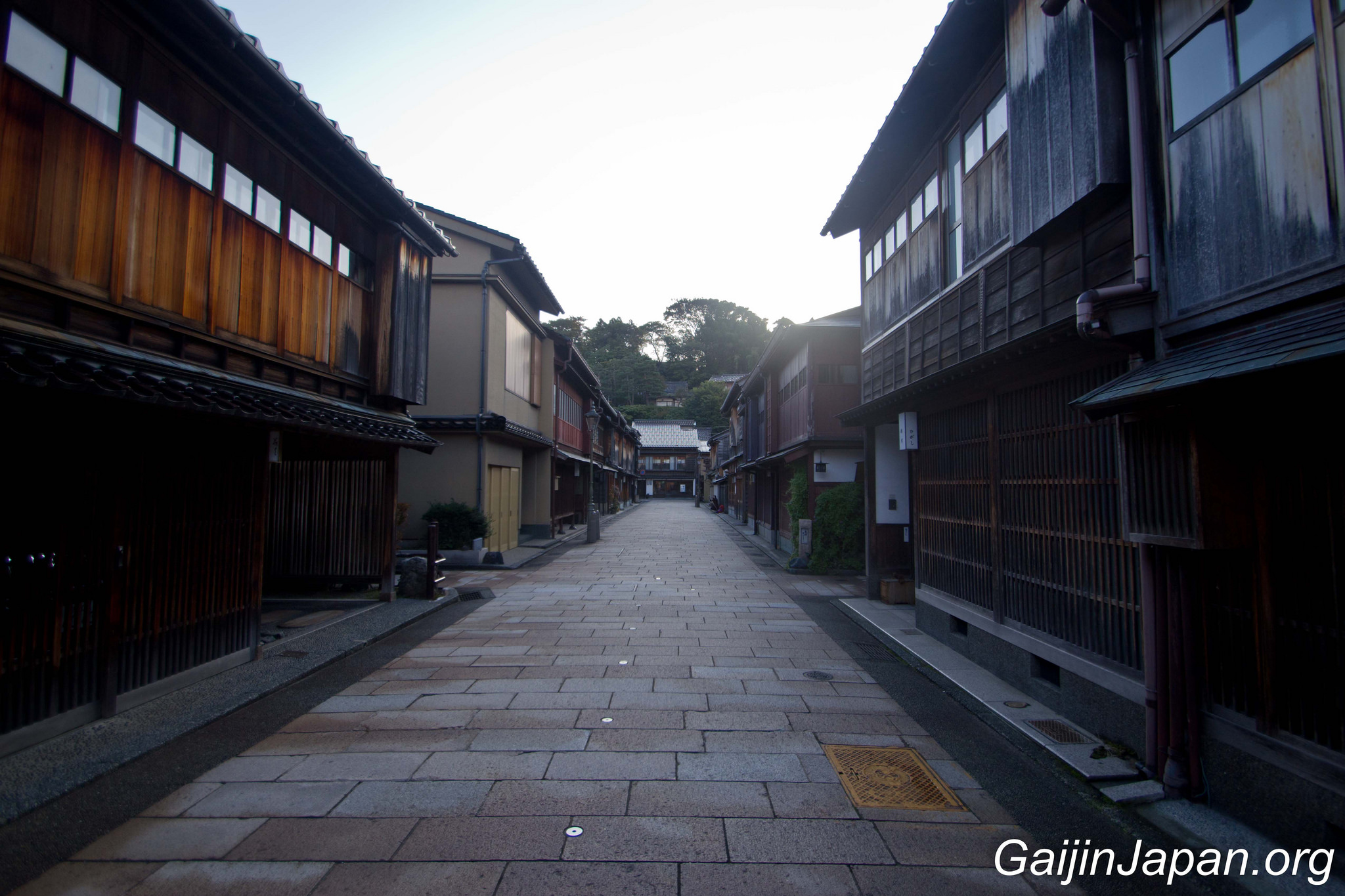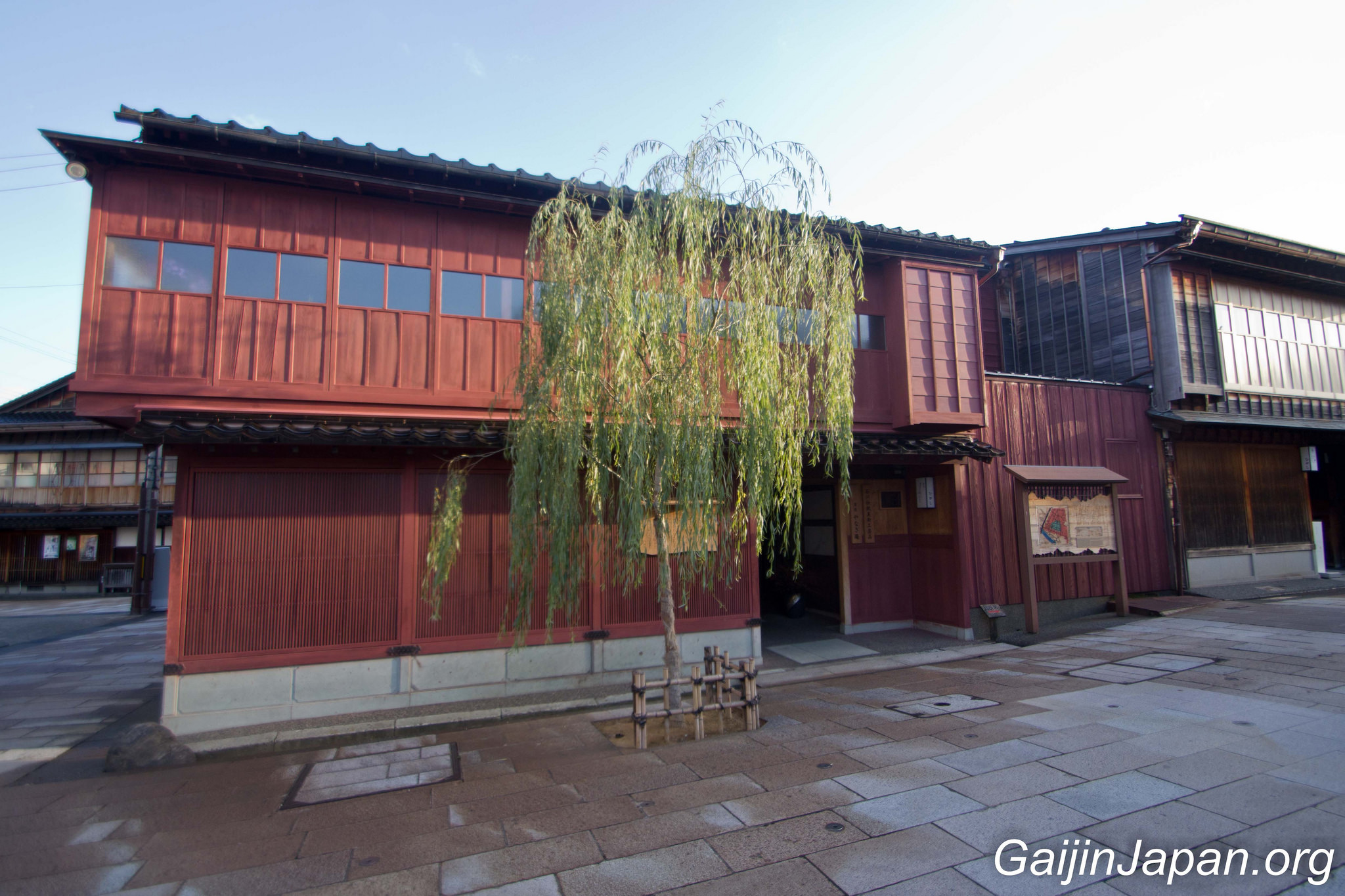 Durant l’époque Edo, il y avait des Chaya à Kanazawa, un peu de partout, parsemé dans la ville. Puis, en 1820 elles ont été réunies en quatre quartiers différents, éloignés du centre de la ville. Le plus grand de ces quartiers n’était autre que Higashi Chaya Gai (東茶屋街). Il consiste en une allée principale où sont alignées, face à face, de nombreuses Chaya avec leur façade en bois composée d’une partie appelée « Kimusuko », des croisillons en bois.