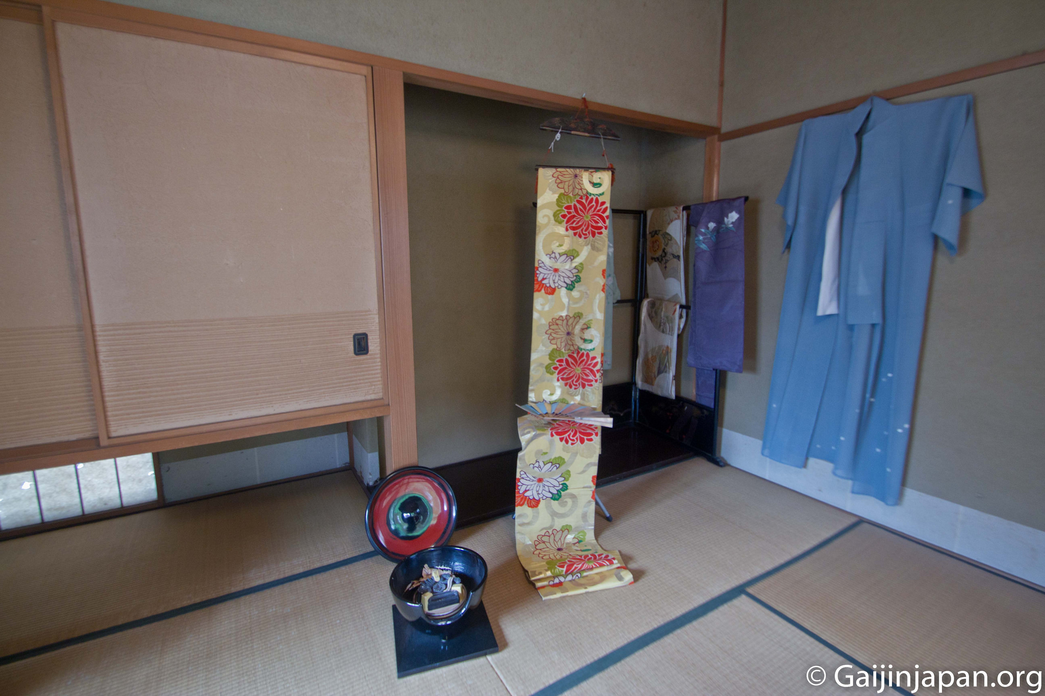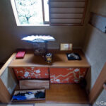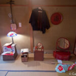 Un escalier en bois sur la gauche nous emmène au niveau des deux premières pièces de la maison, là où les invités étaient reçus par les Geisha ou la maitresse de maison. Une fois ces deux pièces visitées, on continue par un petit couloir offrant une vue sur le jardin verdoyant jusque dans la pièce où les Geisha se préparaient et s’habillaient. Juste à côté se trouve une autre pièce, réservée à leur quiétude, avec une terrasse utilisée pour faire sécher le linge.