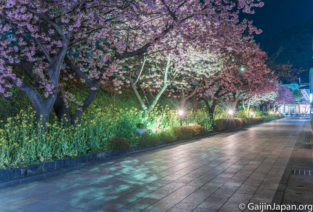 Depuis, de début février à début mars, chaque année, des stands vendant des snacks divers et variés, des Omiyage et même des Kawazu Zakura à planter chez soi, voient le jour pour contenter les voyageurs venus admirer la beauté des fleurs de cerisiers et les immortaliser en photos. Le soir venu, ces derniers sont même éclairés de 18H00 à 21H00 (durant les deux dernières semaines du festival, lorsqu’ils sont en pleine floraison) permettant d’en profiter de nuit (c’est ce que l’on appelle les Yozakura – Sakura de nuit).