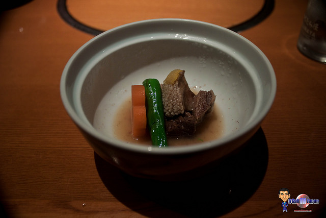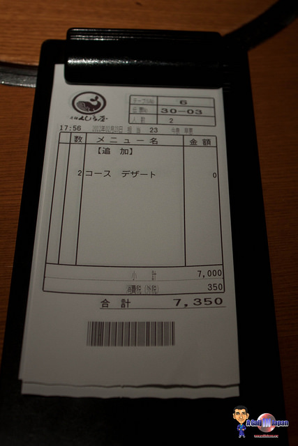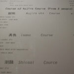 Une fois installé et le menu en main, nous nous rendons vite compte que les tarifs sont quand même assez élevé (minimum 3500 yen chacun pour un menu simple). Et quand nous commandons, nous nous rendons compte que les portions ne sont pas très grande (regardez les photos plus bas pour vous en rendre compte par vous-même).