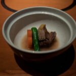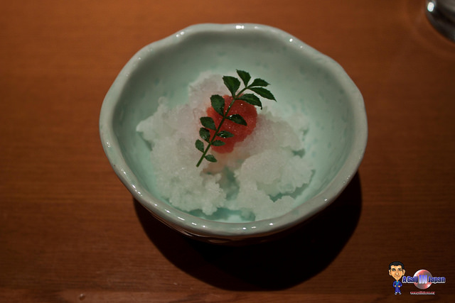C’est là que je tourne la tête pour observer ce que les autres tables mangent et je fais rapidement un calcul pour constater que chaque client mange au minimum 20000 yen de plats. On va être vraiment ridicule avec nos 3500 yen par personne. Mais tant pis on se lance et on apprécie.