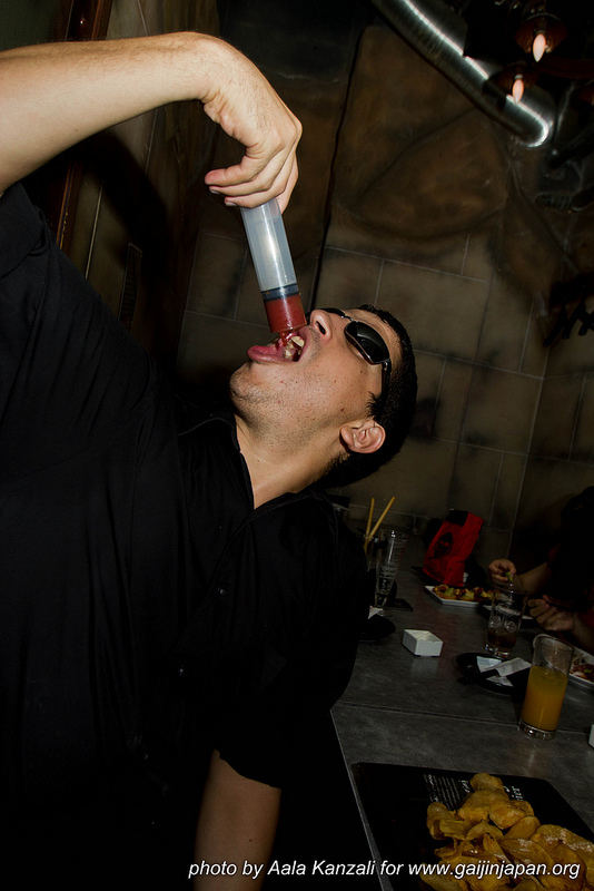 Comme dans tout Izakaya, il faut donc passer commande et se faire servir des plats, normaux ou originaux. Mais contrairement aux Izakaya ordinaire, les tarifs sont plus élevés (compter entre 2000 et 3000 Yen par personne, minimum). Mais contrairement aux autres lieux, ici la clientèle n’est pas majoritairement des salarymen qui sortent du travail, mais des groupes de jeunes filles japonaises. La clientèle semble vouloir des sensations fortes.