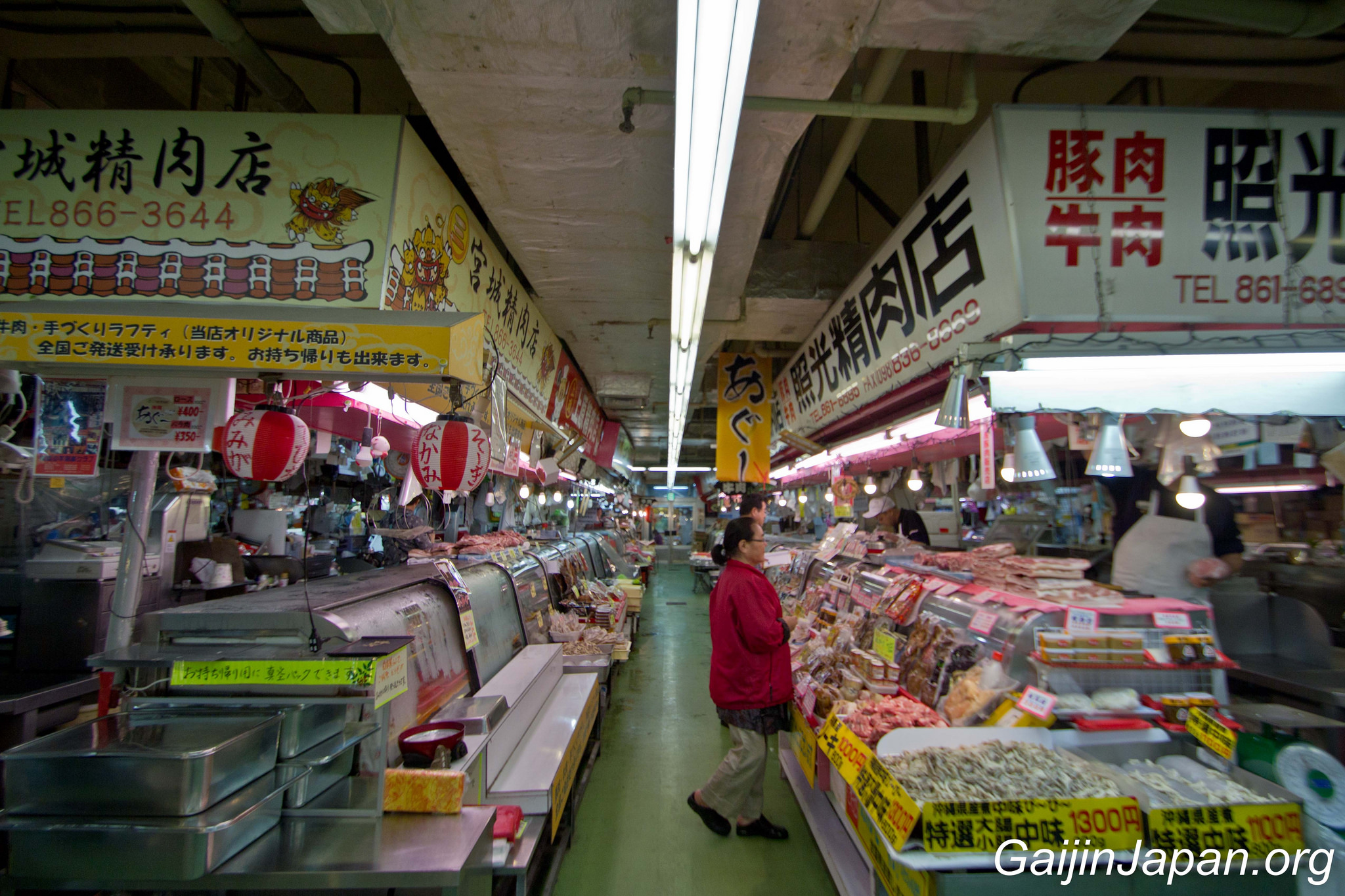 Ah, les marchés japonais, une belle occasion de plonger dans la vie des autochtones et de voir leur quotidien de plus près. Il y en a qui sont célèbres comme le marché de Nishiki à Kyoto, le marché de Tsukiji ou le marché d’Ameyoko à Tokyo et d’autres moins connus mais qui valent le coup d’œil comme le Furukawa Ichiba à Aomori ou encore le marché de Nijo à Sapporo. Et puis, il y a le Makeshi Public Market à Naha.