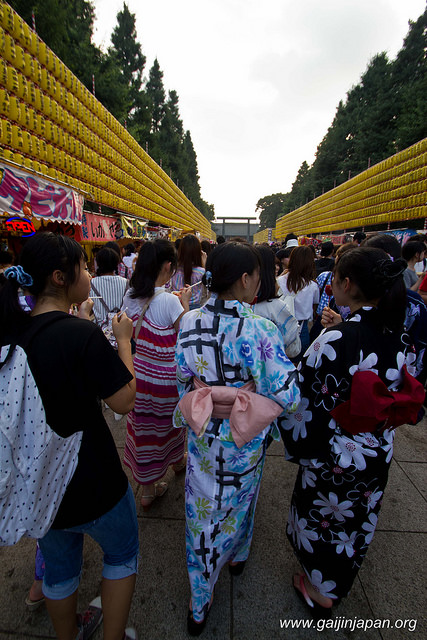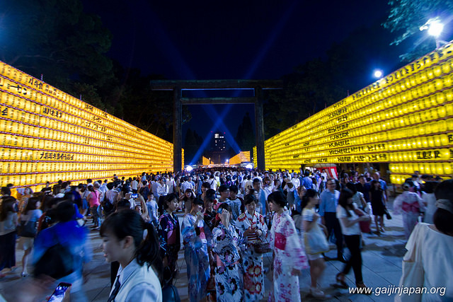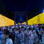 C’est dans le cadre des célébrations liées à O-bon que se déroule le Mitama Matsuri (みたままつり) au sein du sanctuaire Yasukuni (靖国神社) à Tokyo, du 13 au 16 juillet, tous les ans. Normalement, O-bon est célébré, dans l’ensemble du Japon, à la mi-août, à quelques exceptions près, dont le Mitama Matsuri fait évidemment parti.