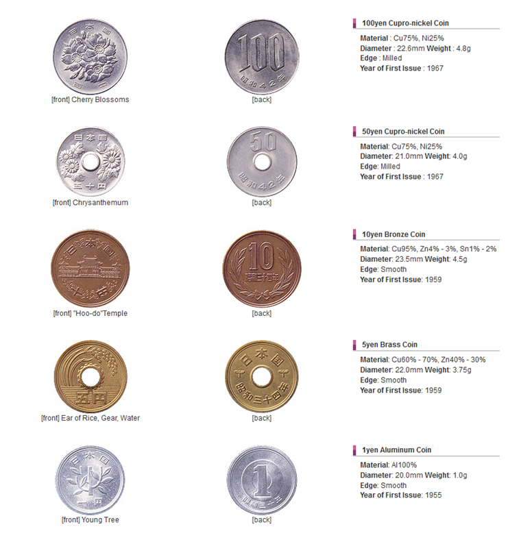 Elles sont au nombre de six : 1, 5, 10, 50, 100 et 500 Yens. Elles auront aussi chacune des caractéristiques spécifiques qui permettront de les différencier aisément au toucher comme au regard.