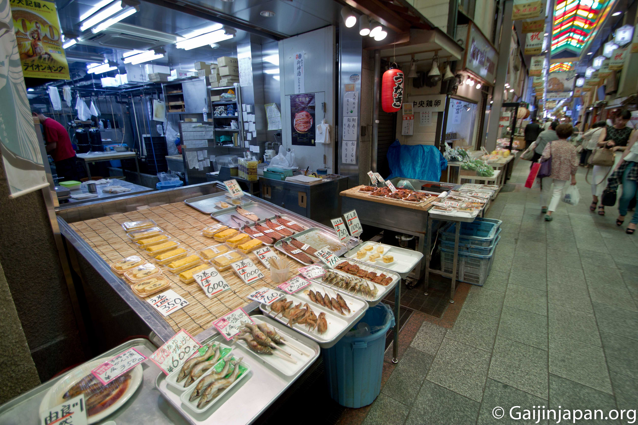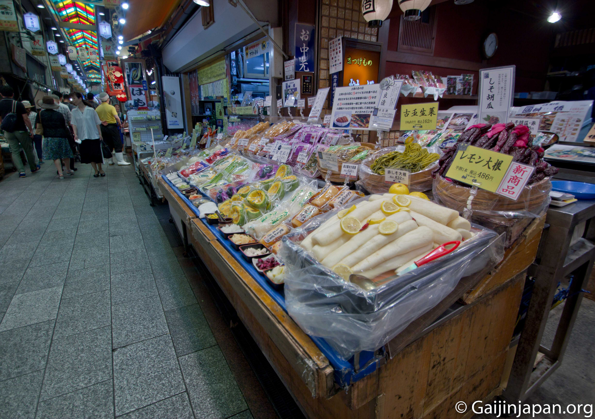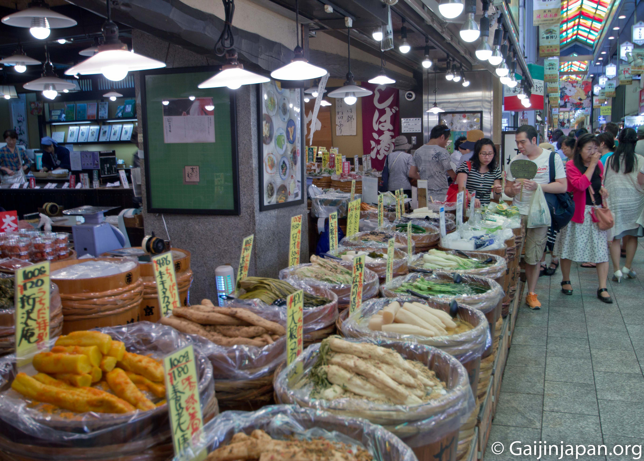 L’un des aspects que les touristes apprécient grandement dans ce marché, outre les couleurs, les saveurs, les odeurs et l’atmosphère générale du lieu, est le fait qu’il est possible, dans bon nombre de magasins, de tester gratuitement les produits mis en vente. Ainsi, tout en se baladant et en en prenant plein les yeux il est possible de se remplir la panse avec de succulents produits locaux, notamment les célèbres Tsukemono (légumes marinés).