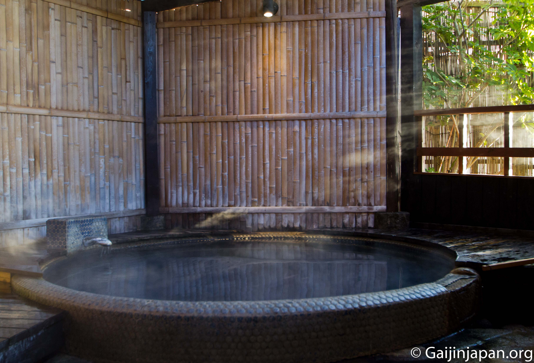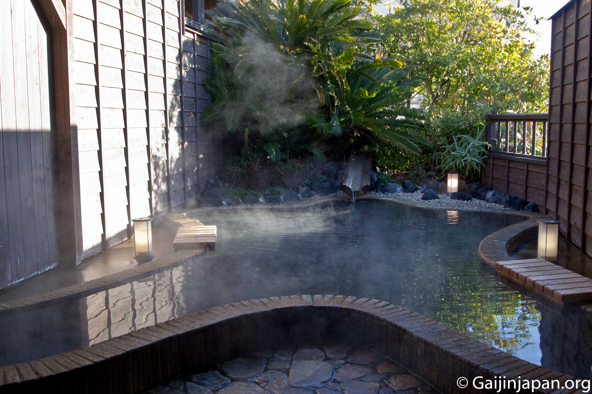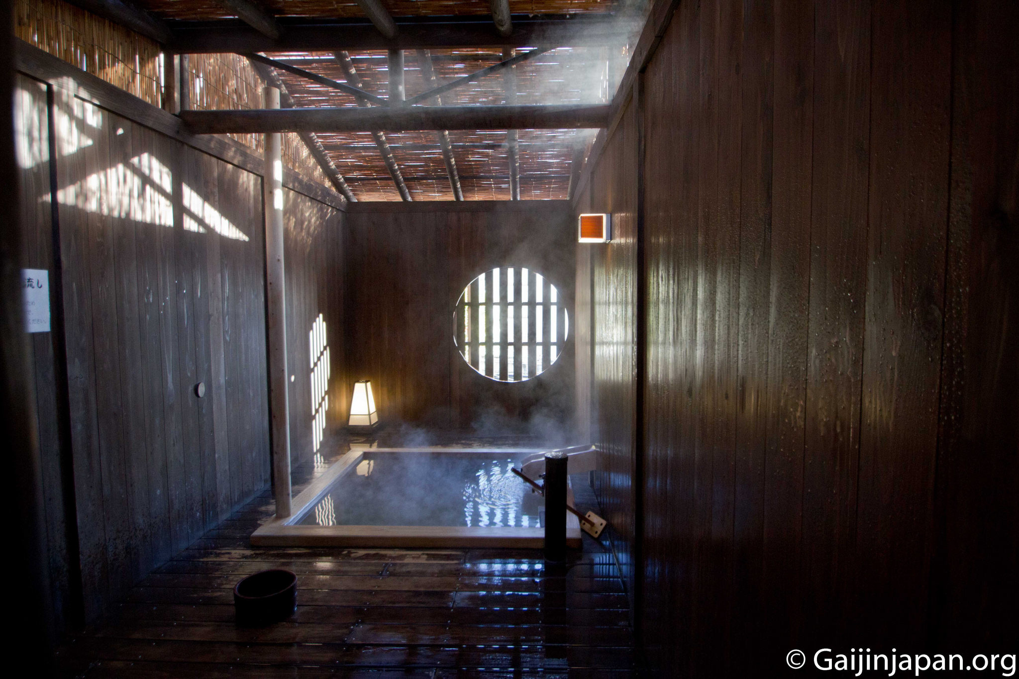 - Bain en extérieur – 露天風呂 (Rotenburo) ou 外湯 (Soto Yu)