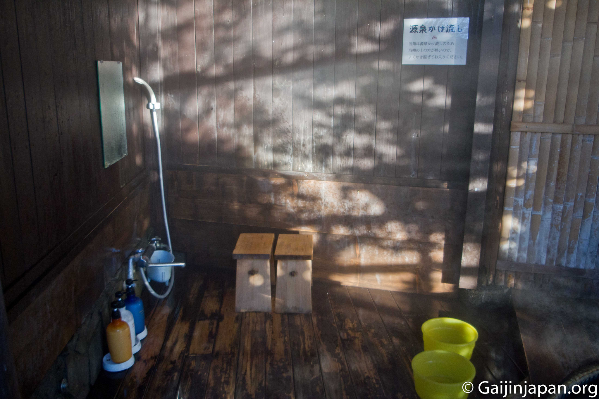 - Passez à l’étape du Kakeyu (かけ湯) qui va vous permettre de préparer votre corps pour la température chaude du Onsen. Pour ce faire, prenez la petite bassine à votre disposition et remplissez là d’eau chaude. Versez cette eau sur votre corps en commençant par les extrémités (mains et pieds, jambes et bras, corps puis la tête). Cette étape vous permettra de mieux supporter le changement de température une fois dans le bain.