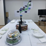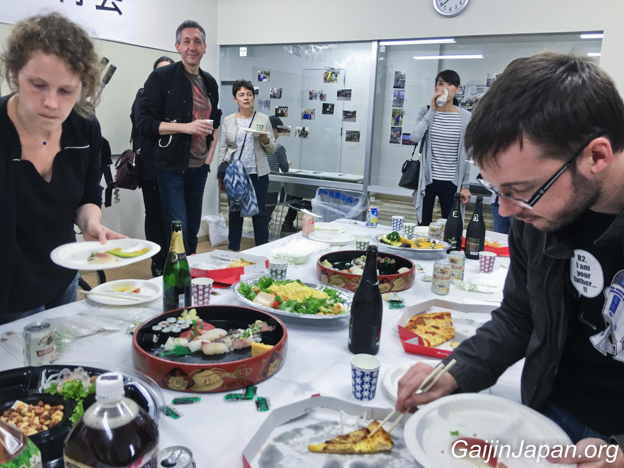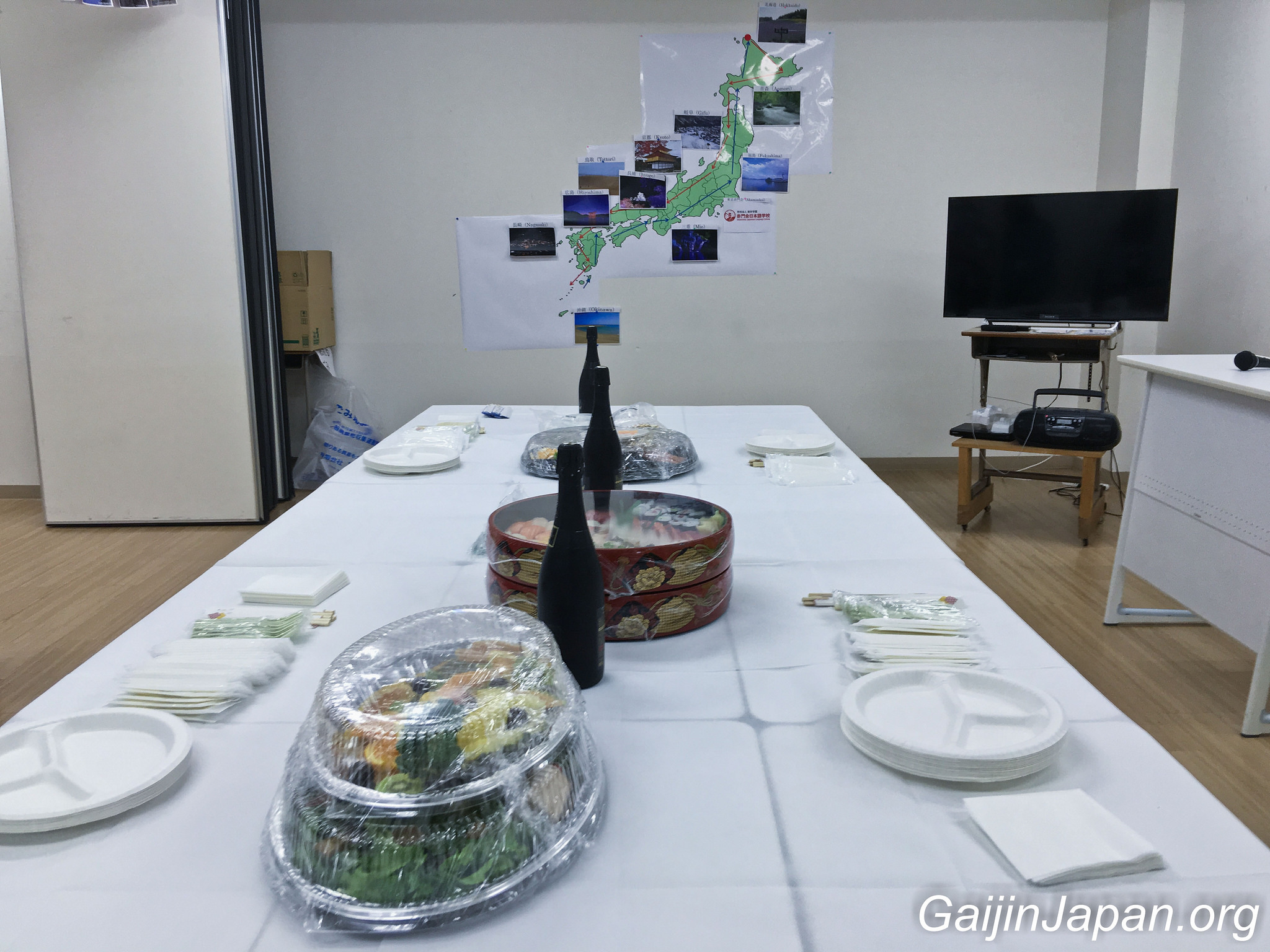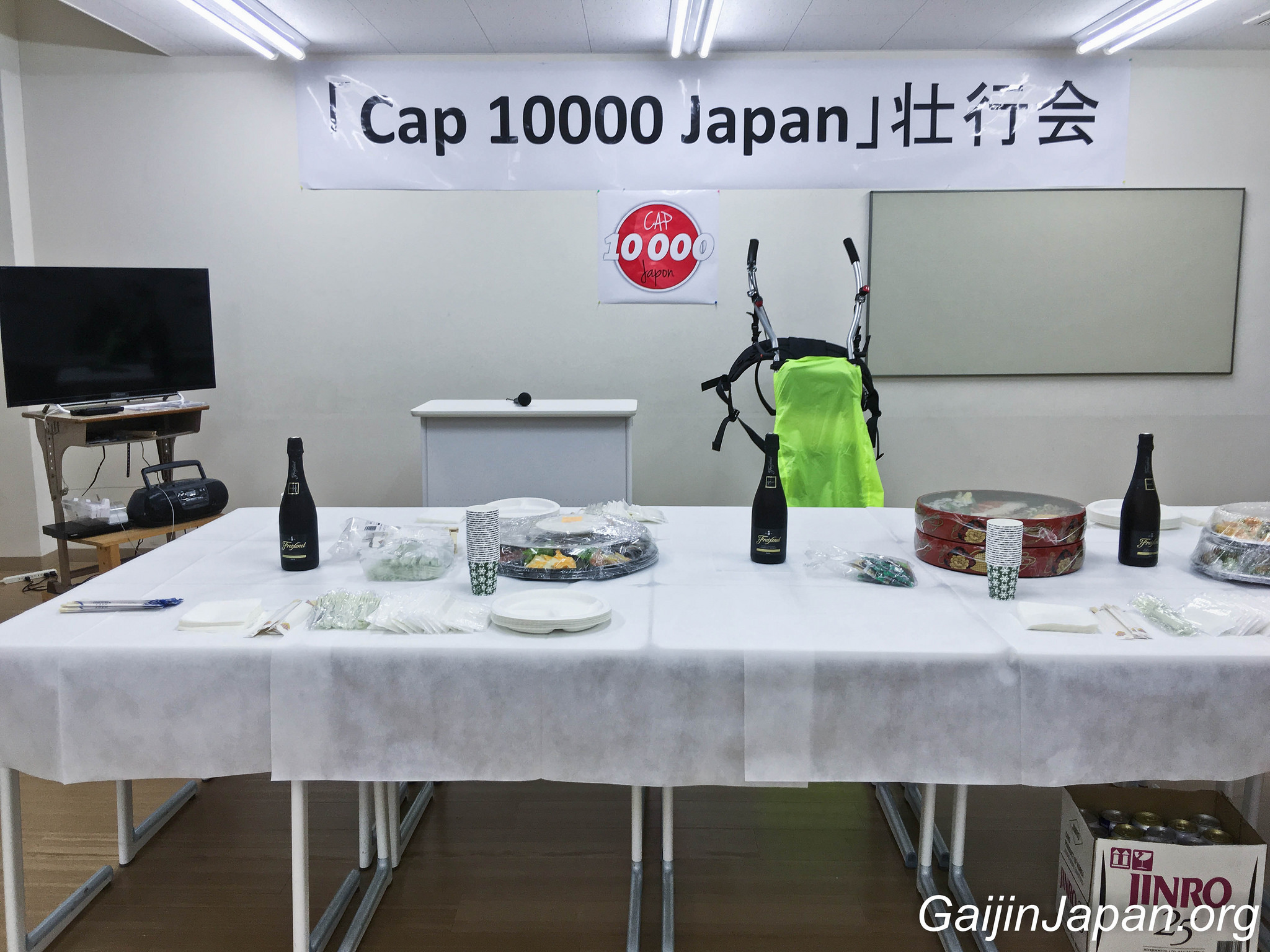 Mieux encore, deux salles de l’école avaient été arrangées afin d’accueillir tout ce beau monde, avec un buffet composé de pizza, sushi et autres snacks et accompagné de plusieurs bouteilles de champagne. Les murs des salles étaient décorés de mes photos ainsi que d’un grand plan représentant le circuit de ma marche ! Akamonkai avait mit les petits plats dans les grands et s’était donné beaucoup de mal pour me souhaiter un bon départ.