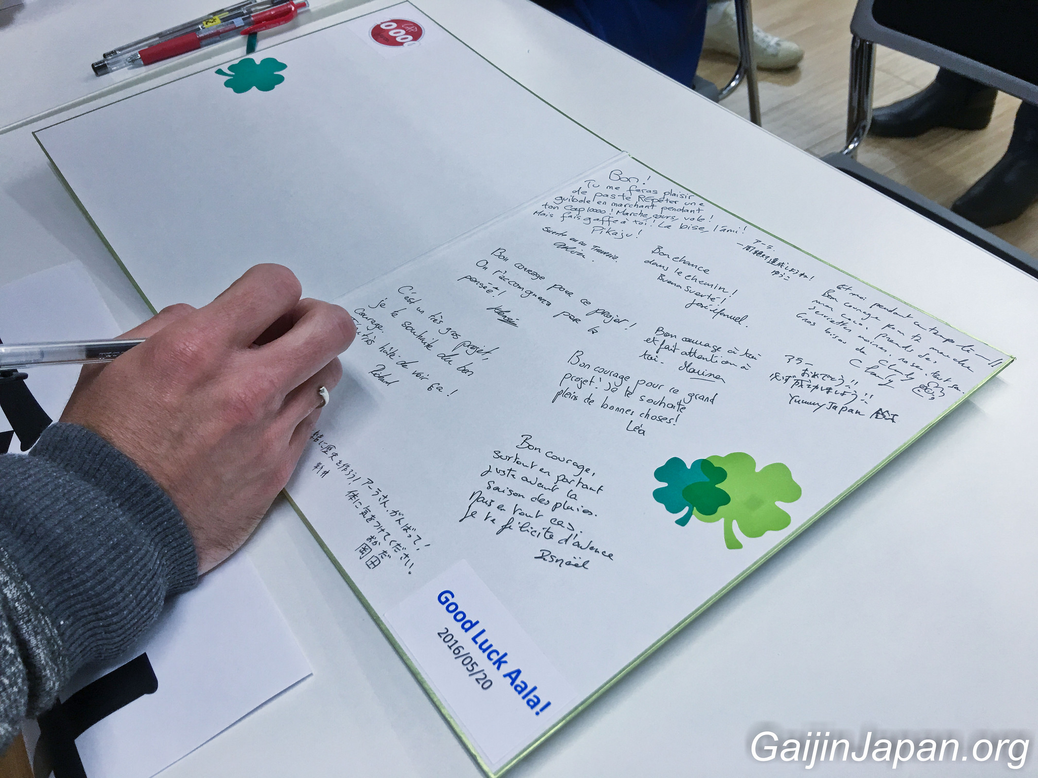 Même le directeur de l’école, que je rencontrais pour la première fois, est venu pour faire un discours et me souhaiter bonne chance ! Le staff de l’établissement avait aussi acheté un Omamori, pour me porter bonheur pendant la marche et avait mis en place un livre d’or pour que les invités puissent me laisser des mots d’encouragements !