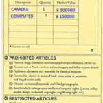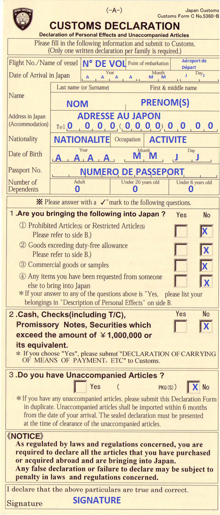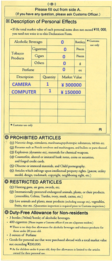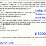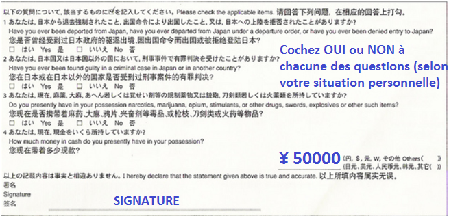Au dos de la carte d’immigration, sur la partie de droite, il vous est posé quelques questions où il faut répondre par « OUI » ou « NON » (répondez-y avec franchise et attendez-vous à des questions plus poussées si vous répondez « OUI » à une ou plusieurs questions). En plus, il vous sera demandé de déclarer le montant en espèces que vous avez avec vous. Si vous avez plus d’un million de Yens par personne il vous faudra vous en justifier.