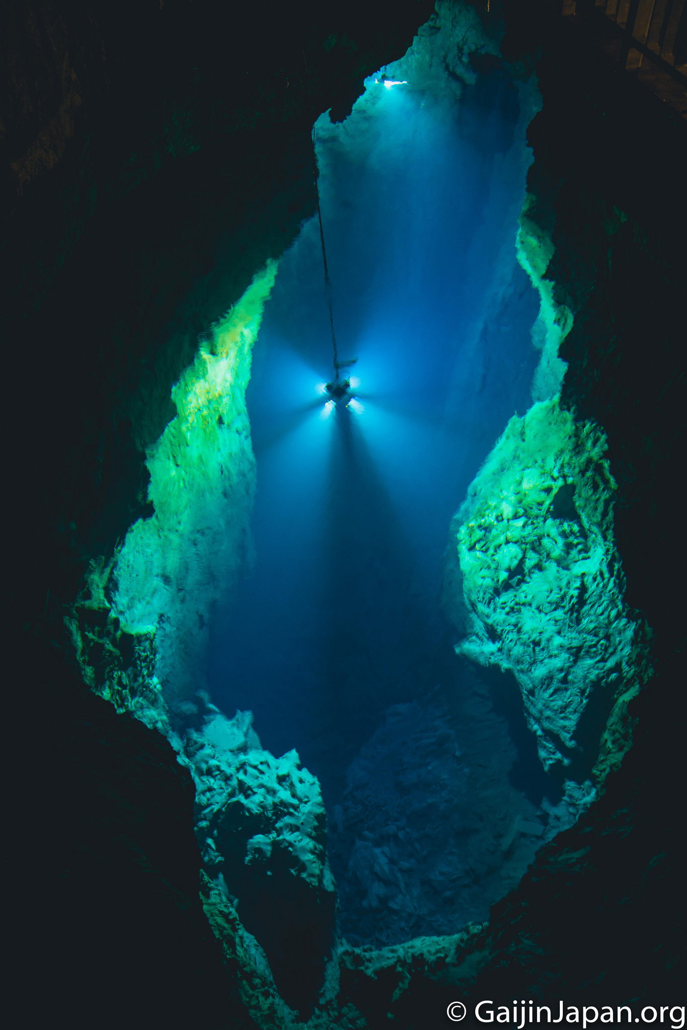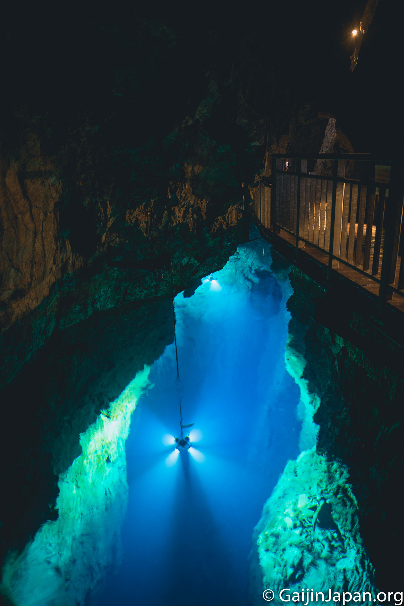 35, 38 et 98 … ce sont les profondeurs des 3 lacs que vous pourrez voir dans cette grotte. A noter que leur eau est considérée comme étant la plus transparente au Japon ce qui fait que vous pourrez voir au travers de ces lacs comme comme au travers d’une vitre (un système d’éclairage astucieux a été mis en place pour cela).