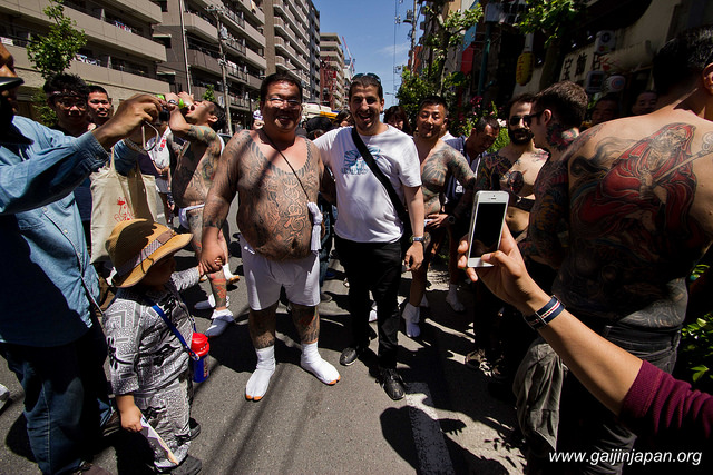 L’une des attractions phare du Sanja Matsuri à Asakusa, n’est autre que la présence en masse des Yakuza, ces membres de la mafia japonaise. Ils sont là, bel et bien là, ne se cachent pas et s’exhibent fièrement, notamment leurs tatouages.