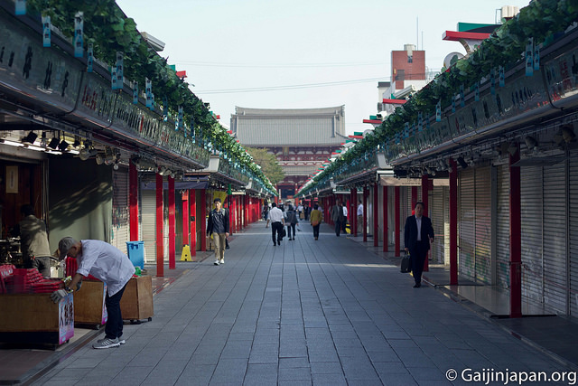 – Nakamise Dori (仲見世通り): il s’agit de l’allée commerçante se trouvant juste après Kaminarimon, et étant composée de dizaines de petites échoppes vendant des souvenirs du Japon en tout genre et autres spécialités culinaires japonaises.
