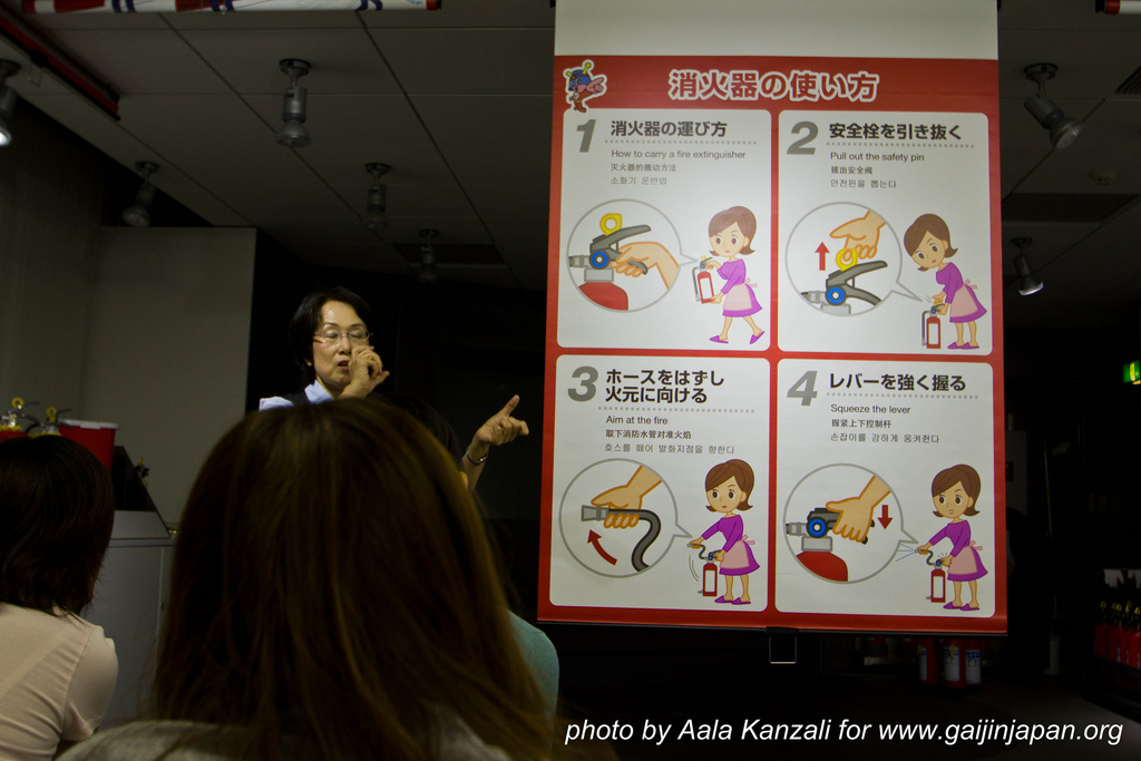 Je me suis rendu là-bas le 20 juillet 2012 avec mon ami Sean (avec qui j’ai expérimenté la roulette russe version sushi, ou bien qui a essayé la viande de chien à Shin-Okubo, Tokyo). Nous y sommes allés le matin même, sans réservation, mais malheureusement c’était complet. Nous avons donc réservé pour l’après-midi même. A 15h00, notre apprentissage commençait. Au programme, nous avons eu le droit à la projection d’un vidéo bilan du tremblement de terre du 11 mars 2011 (où étrangement, le nom de Fukushima était inexistant), suivit d’un cours d’utilisation des extincteurs, puis d’un cours sur les démarches à suivre pour s’enfuir d’une pièce enfumée et enfin le simulateur de tremblement de terre.
