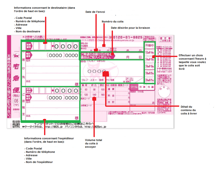 Dans l’article « envoyer des colis du Japon » vous retrouverez du vocabulaire utile pour vos envois en Takkyubin. Et voici un exemple de bordereau avec les informations à connaître (mais ne vous inquiétez pas, il y aura toujours quelqu’un pour vous aider).