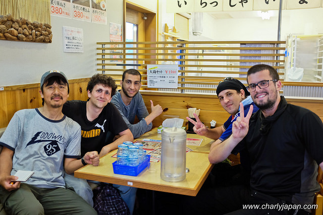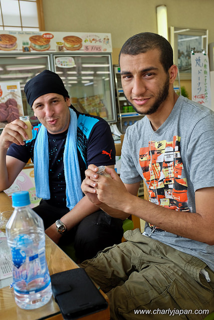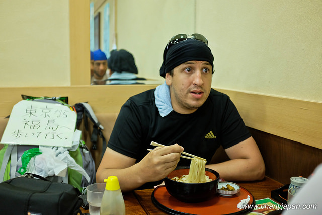 – La vieille dame qui nous trouvait délicieux : entré dans la préfecture de Fukushima, on s’arrête dans un Izakaya local pour manger un bout. Une vieille dame en cuisine me regarde et me balance un « Ikemen » (beau gosse », puis elle fait de même pour Abdel et Charles. Et ensuite, elle nous regarde et elle dit « Oishiso » (vous avez l’air délicieux), ce qui nous a pas mal surpris mais bien fait rire.