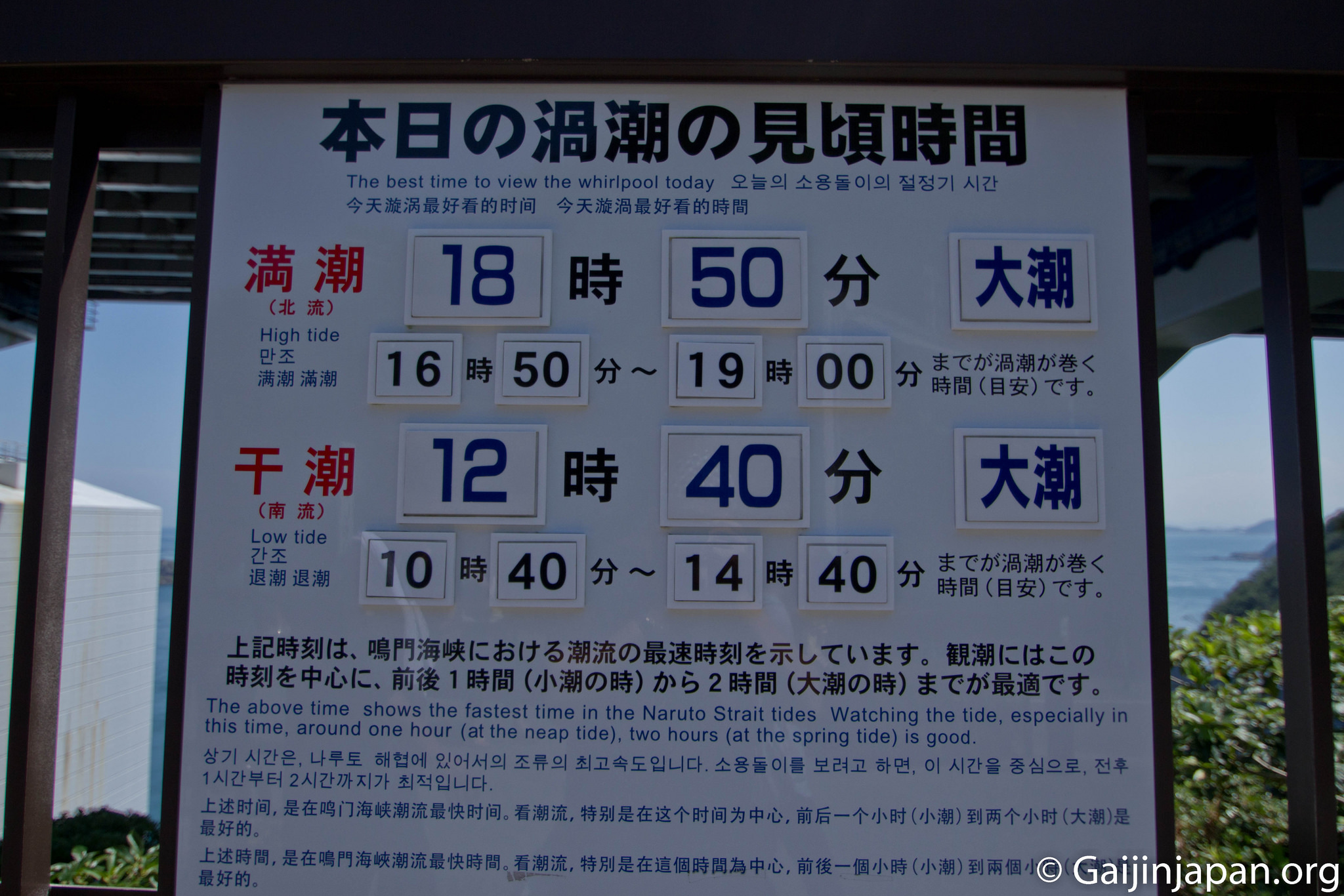 Au cours de l’année, il est possible d’observer les tourbillons à Naruto deux fois par jour, aux environs des marées basses et marées hautes. C’est au cours de l’automne et du printemps que les tourbillons vont atteindre leur potentiel maximum en termes de taille et de puissance, du fait de plusieurs facteurs naturels (marées, positionnement du soleil et de la lune, …).