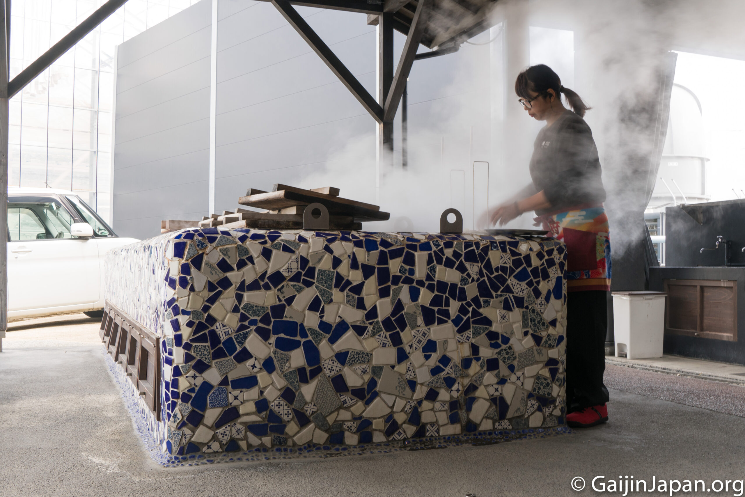Direction Beppu, après cette courte escale distillerie de Sake, et plus précisément Jigokumushi Kobo Steam Cooking, un endroit particulier dans la ville où les plats sont cuisinés avec les sources d’eaux chaudes locales et où l’on mange les pieds dans un bain d’eau chaude, bien chaude!