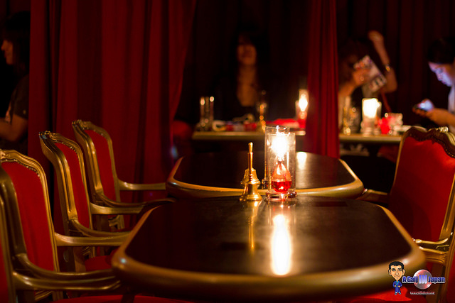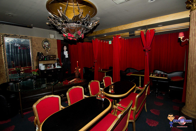 Il n’est pas très facile à trouver car il se cache dans un bâtiment, dans une petite rue, dans le quartier de Ginza. Une fois arrivé sur place et le seuil de la porte franchit, vous êtes dans l’ambiance. Tout est en velours rouge, avec des dorures et des éléments de décorations de style goth.