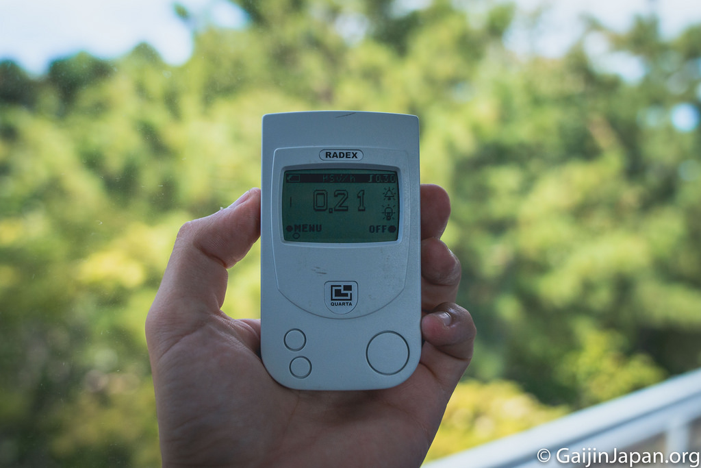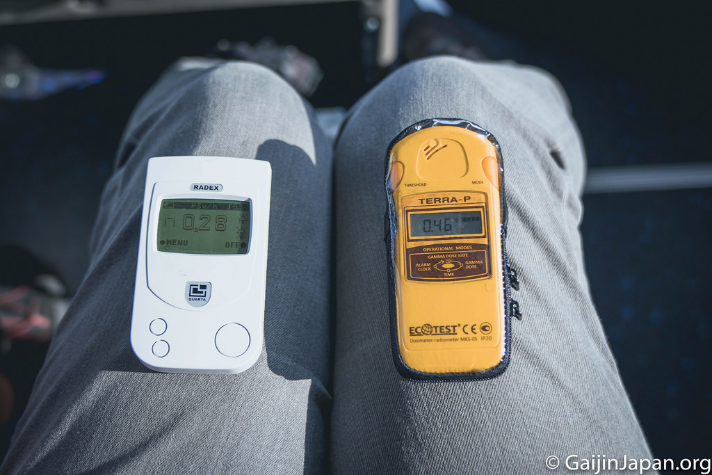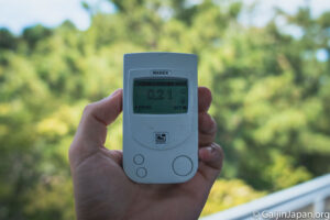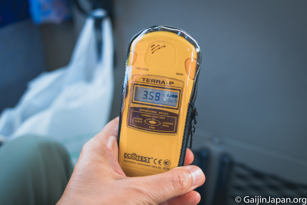Une fois de retour à Tokyo, Takuto-san nous montre le bilan d’exposition à la radiation pour la journée sur le compteur Geiger : 0,002 millisieverts et il compare cela à un vol Tokyo – New-York qui est équivalent à une exposition de 0,1 millisievert.