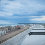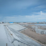 Quelques minutes plus tard on se retrouve en bord de mer. Là, le long de la plage un mur anti-tsunami de neuf mètres de haut est en cours de construction. Me vient à l’esprit la hauteur maximale des « vagues » dans les environs, qui étaient de 21 mètres, et je me demande donc l’utilité d’un mur de 9 mètres de haut face à un Tsunami de 21 mètres. On est à quelques kilomètres, à vol d’oiseau, de la centrale nucléaire de Fukushima Daiichi. On est à 6 km de celle-ci et derrière les arbres, au fond, on voit le haut des grues qui travaillent sur l’édifice.