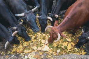 Je regarde alors les vaches, prends quelques photos et je demande à Yoshizawa-san, avec une certaine stupeur, pourquoi ces dernières mangent des peaux d’ananas ? Il me répond que c’est ce qui lui coûte le moins cher tout en restant bon pour la santé de ses bêtes. Ce sont les mêmes vaches qu’il avait depuis 2011 et avant. Vaches dont il ne peut plus rien faire, ni exploiter le lait, ni la viande, ni rien, mais qu’il garde en vie car ce sont des êtres vivants et ses animaux de compagnie. Il n’est pas dédommagé par les autorités japonaises pour les garder en vie et tous les frais sont à sa charge. Cela fait donc 7 ans qu’il les nourrit de sa poche. Et je lui demande alors pour combien de temps encore il va devoir les entretenir. Il me répond qu’il faudra attendre encore environ 8 ans pour qu’elles meurent naturellement. Il les aura donc nourries, à sa charge, sans aucun retour financier, pour 15 ans, parce qu’il les considère comme ses animaux de compagnie et qu’il refuse de les exécuter.