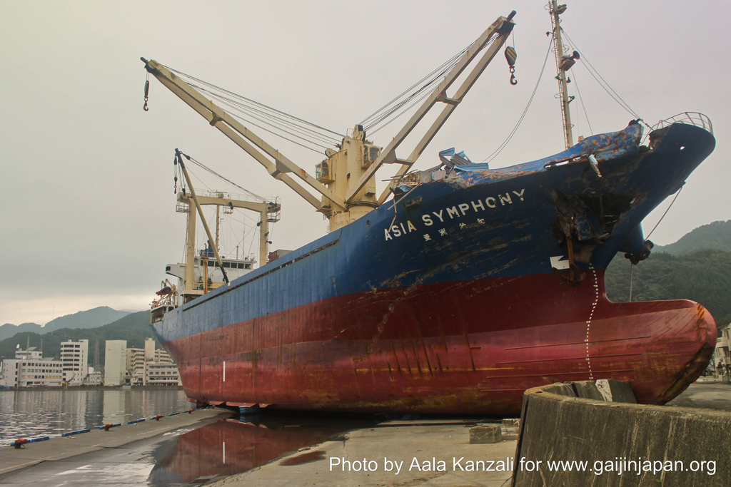 On s’est alors rendu sur place, à côté du centre ville, et là j’ai été extrêmement surpris. Ce n’est pas un simple bateau que le Tsunami a déplacé mais un bateau cargo. Un immense bateau marchandise, l’ASIA SYMPHONY, avait été littéralement porté hors de la mer et projeté aux abords de la route. Il faut vraiment le voir pour le croire, et cela permet de constater à quel point le Tsunami était puissant.