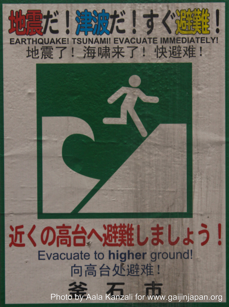 J’ai pu aussi constater que tout autour de la ville des panneaux de signalisations rappelaient la probabilité de Tsunami et qu’il fallait dans ce cas se réfugier dans les hauteurs avoisinantes. Il faut savoir que Kamaishi est une ville construite en bord de mer, avec un port marchand, et qu’elle est entourée de collines. La ville est comme prise en sandwich entre la mer et les collines.