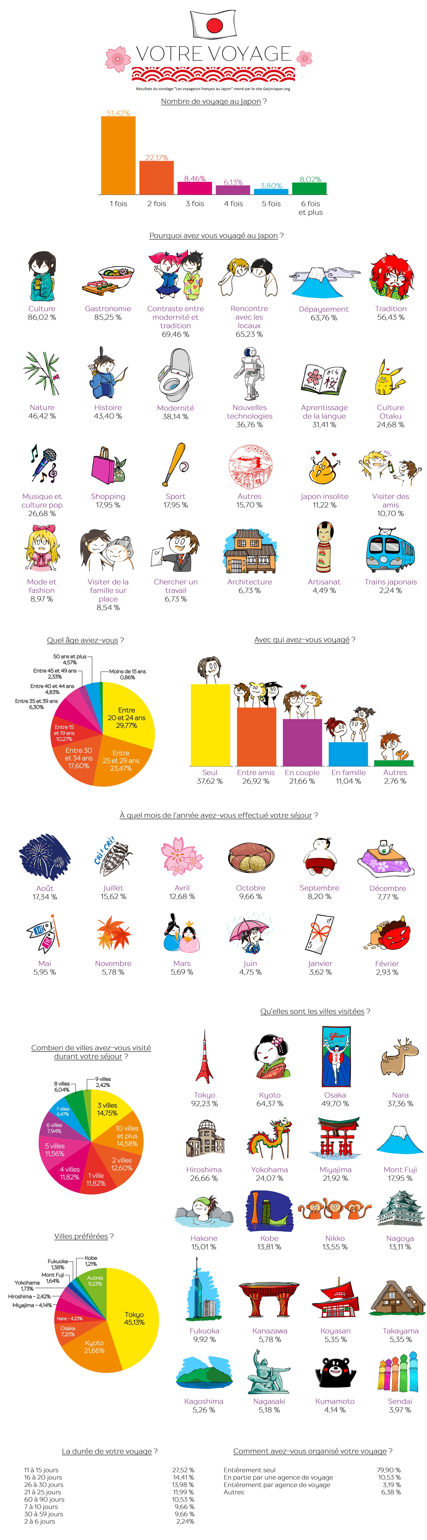 Le 8 janvier 2015 je lançais un sondage pour essayer d’en savoir un peu plus sur le profil des voyageurs français au Japon, parce qu’il faut reconnaître que vous êtes tout de même nombreux à vous rendre au pays du Soleil-Levant. En quelques jours vous avez été plus de 1.500 à répondre aux diverses questions qui vous étaient posées. Après avoir analysé l’ensemble des réponses, fait un tri et une mise en forme, je vous propose ici le condensé des réponses, avec quelques éléments mis en avant le tout accompagné d’infographies pour illustrer les résultats.