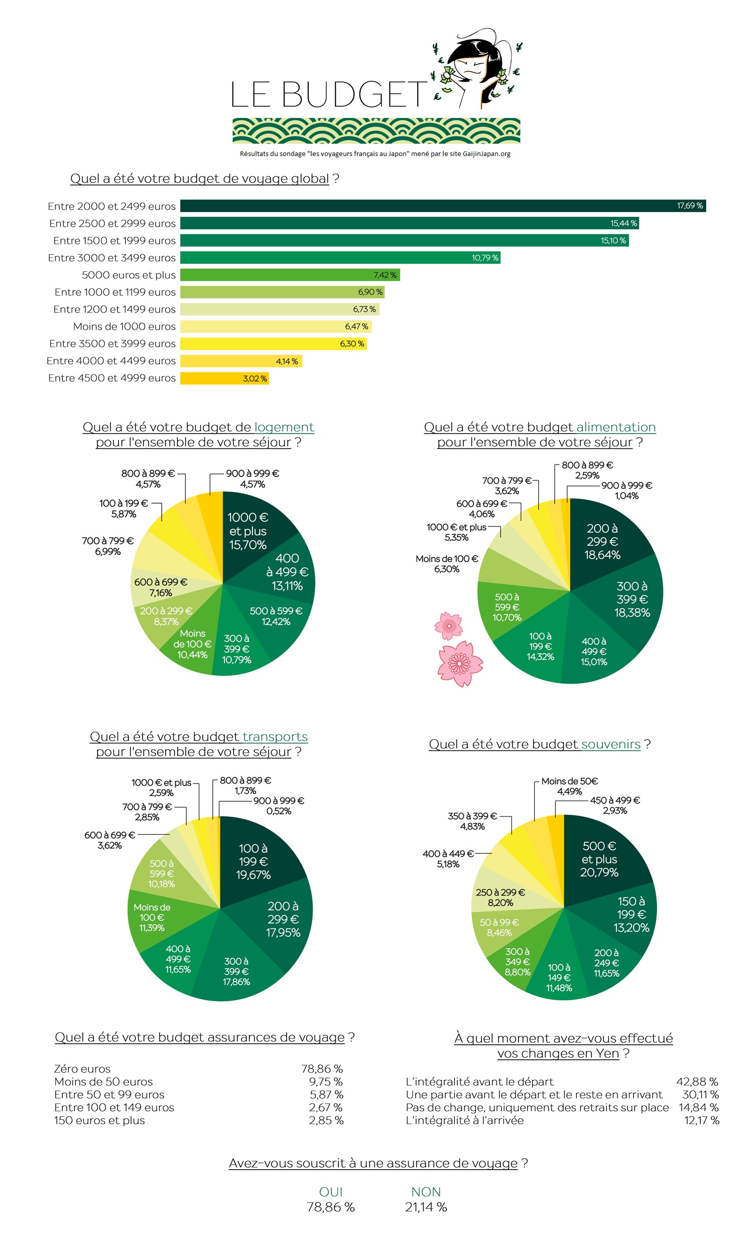 Pour une majorité d’entre vous, le budget de voyage au Japon par personne va se trouver compris entre 2.000€ et 3.000€, en sachant que le logement sera votre premier pôle de dépenses une fois sur place. Et on remarque que vous n’hésitez pas à vous faire plaisir au niveau des souvenirs du Japon.