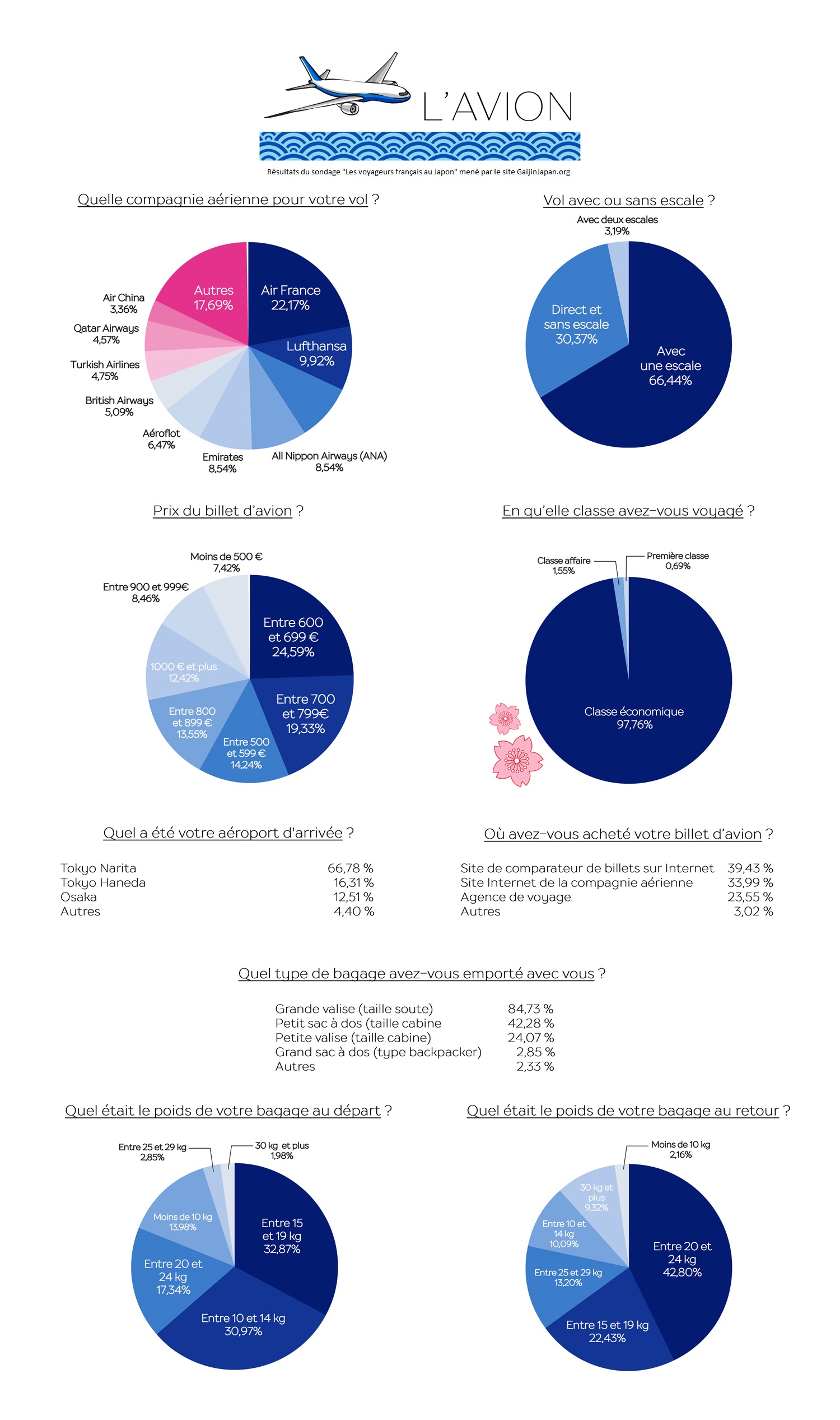 On remarque aussi que vous êtes environ deux tiers à acheter vos billets d’avions sur Internet. Et enfin, allez savoir pourquoi, mais vos bagages sont plus lourds au retour qu’à l’aller (merci les souvenirs).