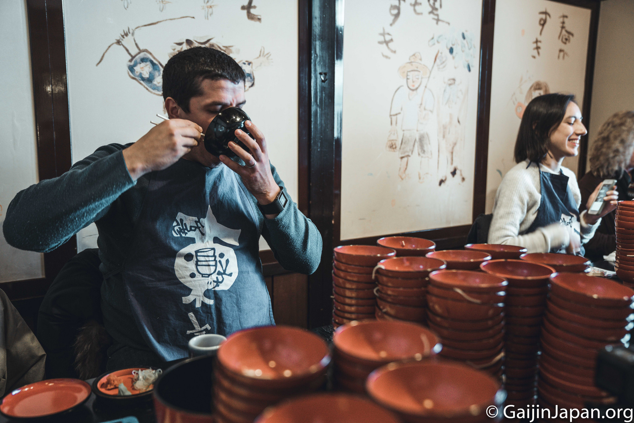 - Une fois le soba mangé, videz la soupe dans l’autre récipient, sans la boire afin de ne pas remplir inutilement votre estomac