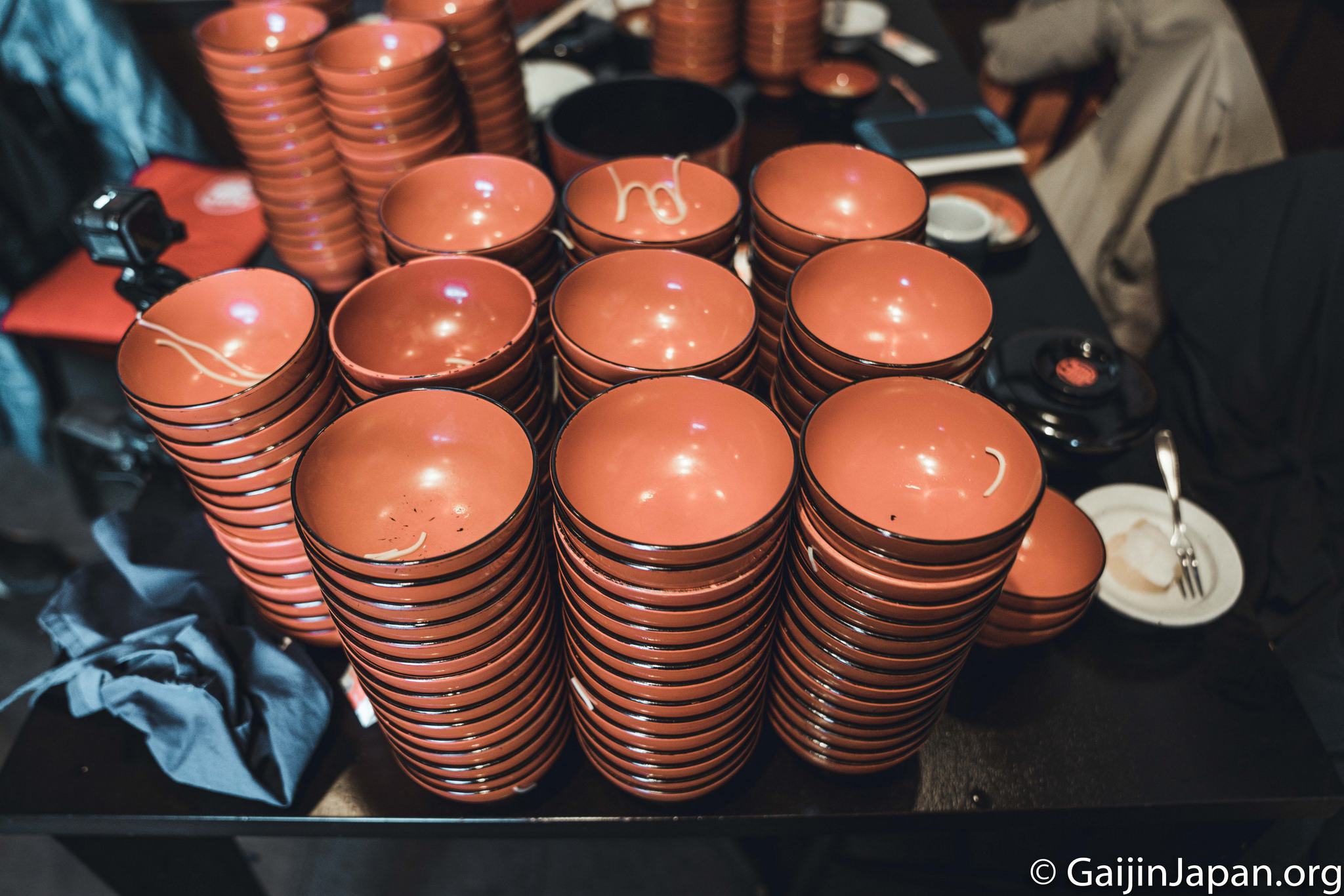 La serveuse, debout à côté de moi tenait un plateau avec 15 petits bols de Wanko Soba, soit l’équivalent d’une portion normale de Soba. A chaque nouvelle bouchée qu’elle remplissait dans mon bol, elle m’encourageait pour pas que je ne cesse de manger. J’ai vu, ainsi, les bols s’empiler devant moi à une vitesse hallucinante jusqu’à atteindre le nombre de 153 … moment auquel j’ai dit « Stop ! » en couvrant mon bol avec son couvercle.